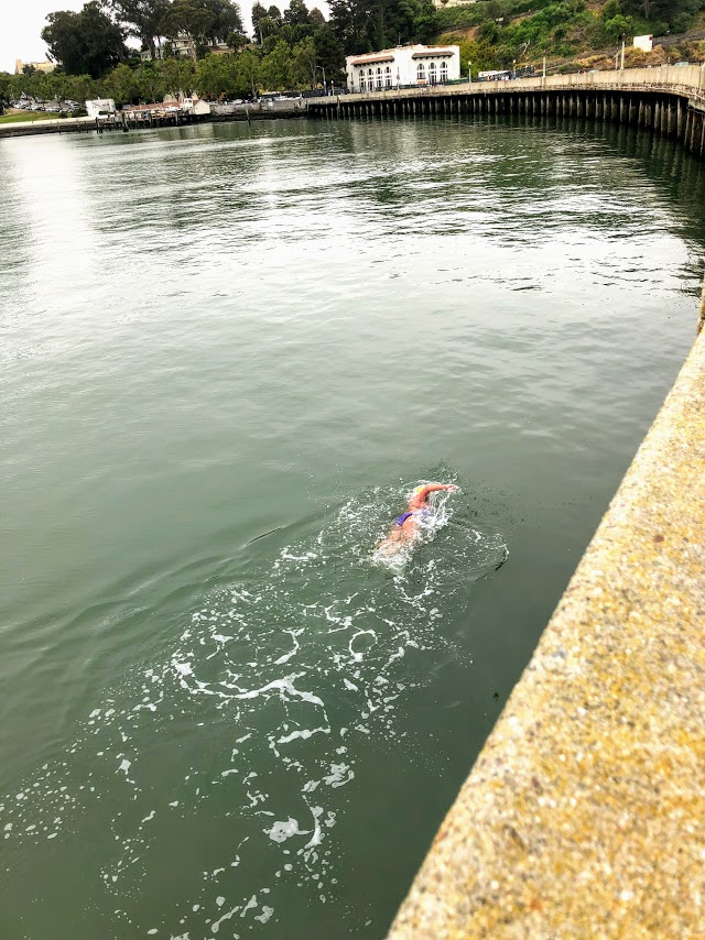 You start out your trip by Fishermen’s Wharf and ride along the water towards the bridge. You stay close to the marinas and will encounter people swimming there. This woman was swimming all by herself beyond to roped off area in Aquatic Park without a wetsuit in the cold water! Impressive or really crazy!