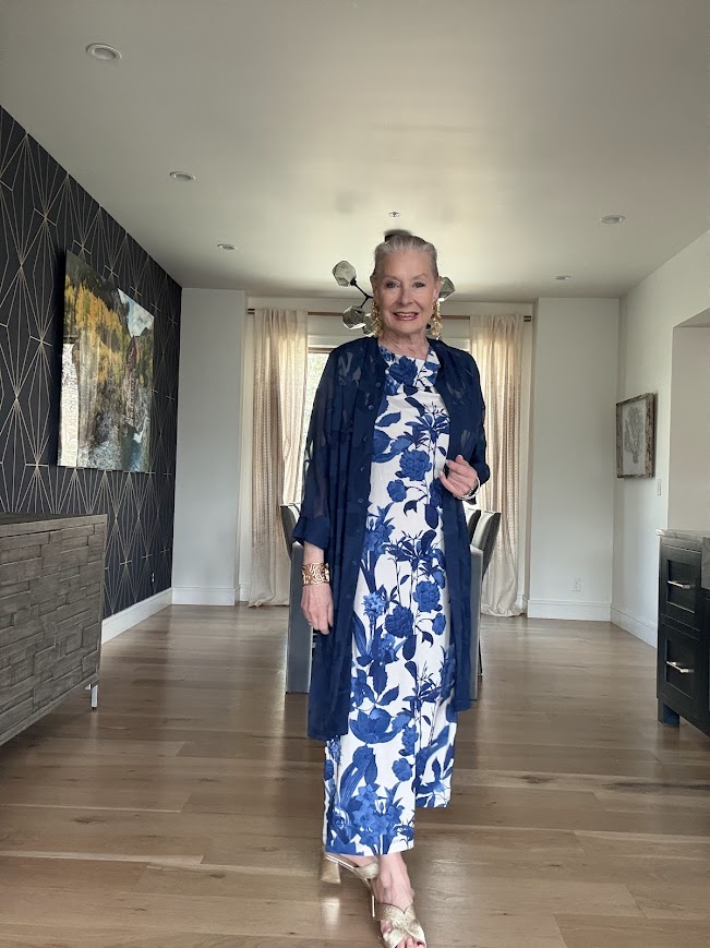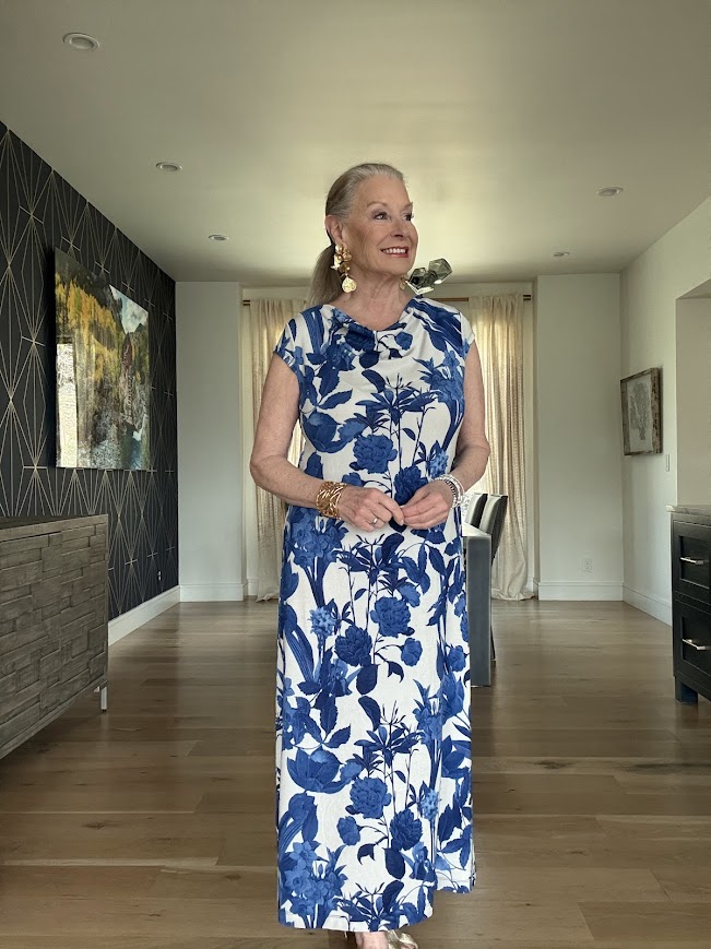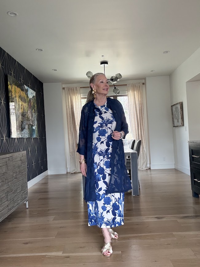 My last dress is the Travelers Cowl Neck Maxi Dress, which can be worn with or without the Travelers Collection Sheer Jacquard Topper. I enjoy wearing an extra layer to special occasions because restaurants can be so chilly, as well as evenings.