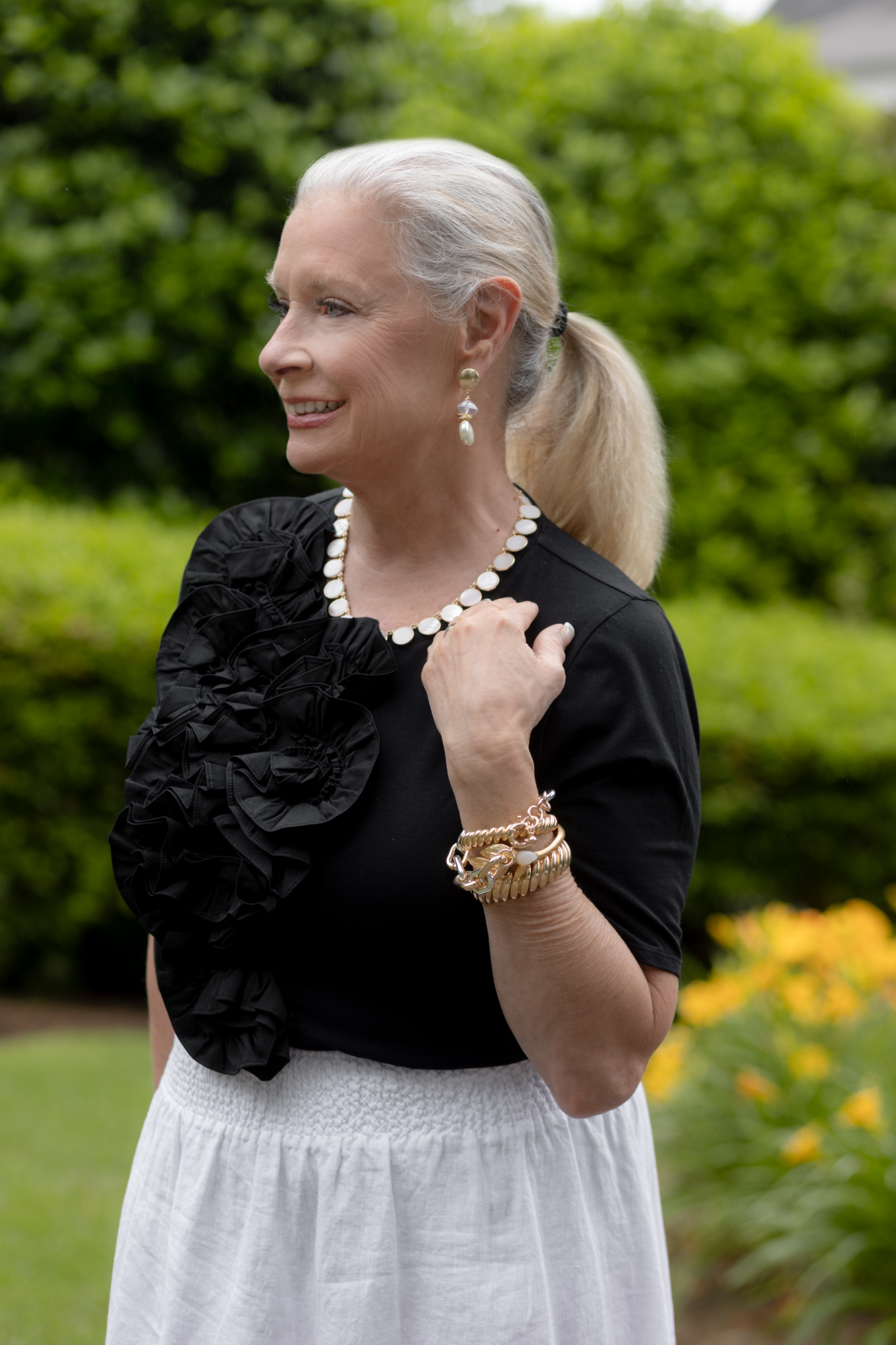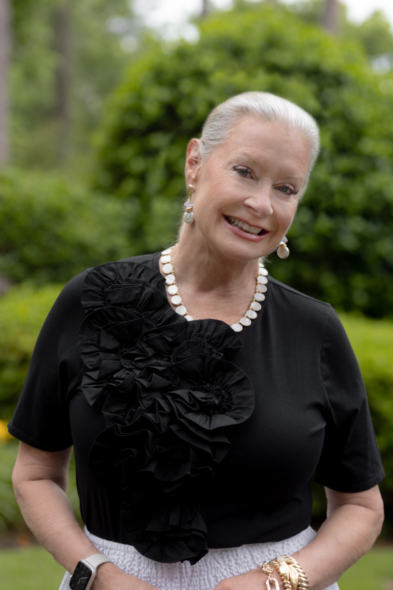 This 3D Ruffle Front Tee is the perfect tee shirt for your next special occasion. It’s on sale, so don’t wait! The woven ruffle detail on the front elevates the easy-knit body. I decided to wear Chico’s Faux Pearl Drop Earrings and the Reversible Mother of Pearl Necklace to elevate the outfit.