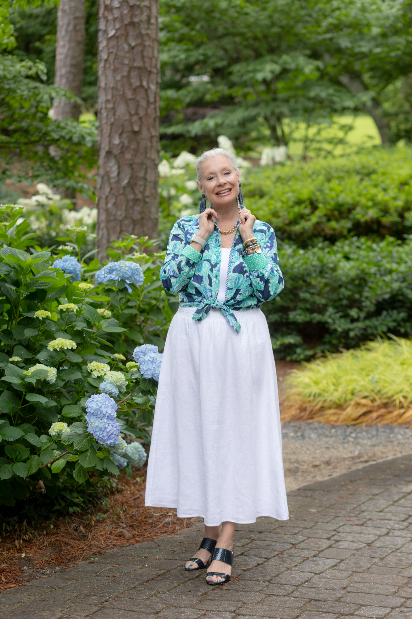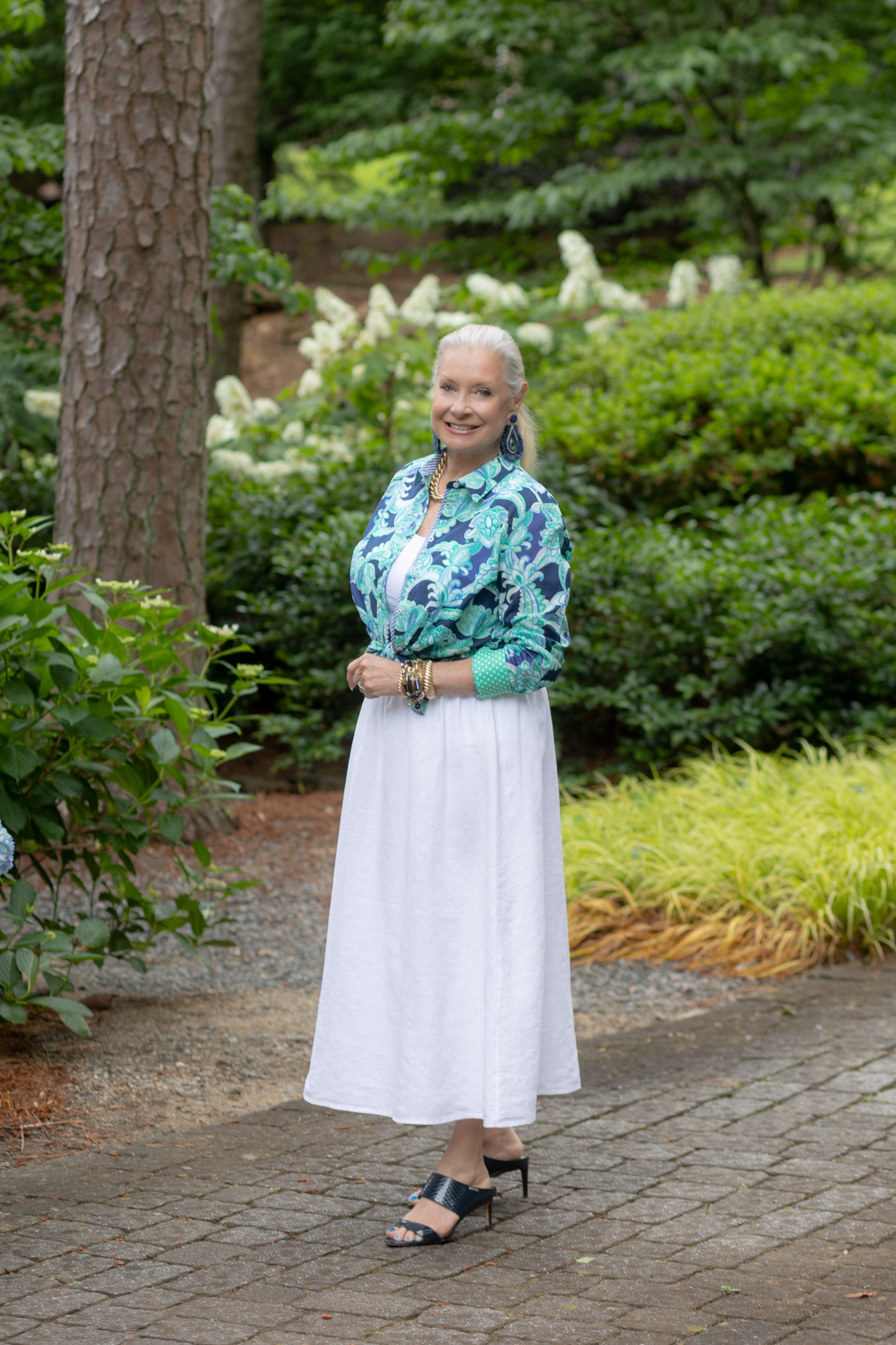 I waited for my hydrangeas to bloom when I purchased this Cotton Button-Front Shirt – Charming Floral, from Talbots at the end of April. The print’s colors look terrific with the Linen A-line Midi Skirt from Chico’s. You can button up the shirt or make it your extra layer like I did over Chico’s Microfiber Tank.
