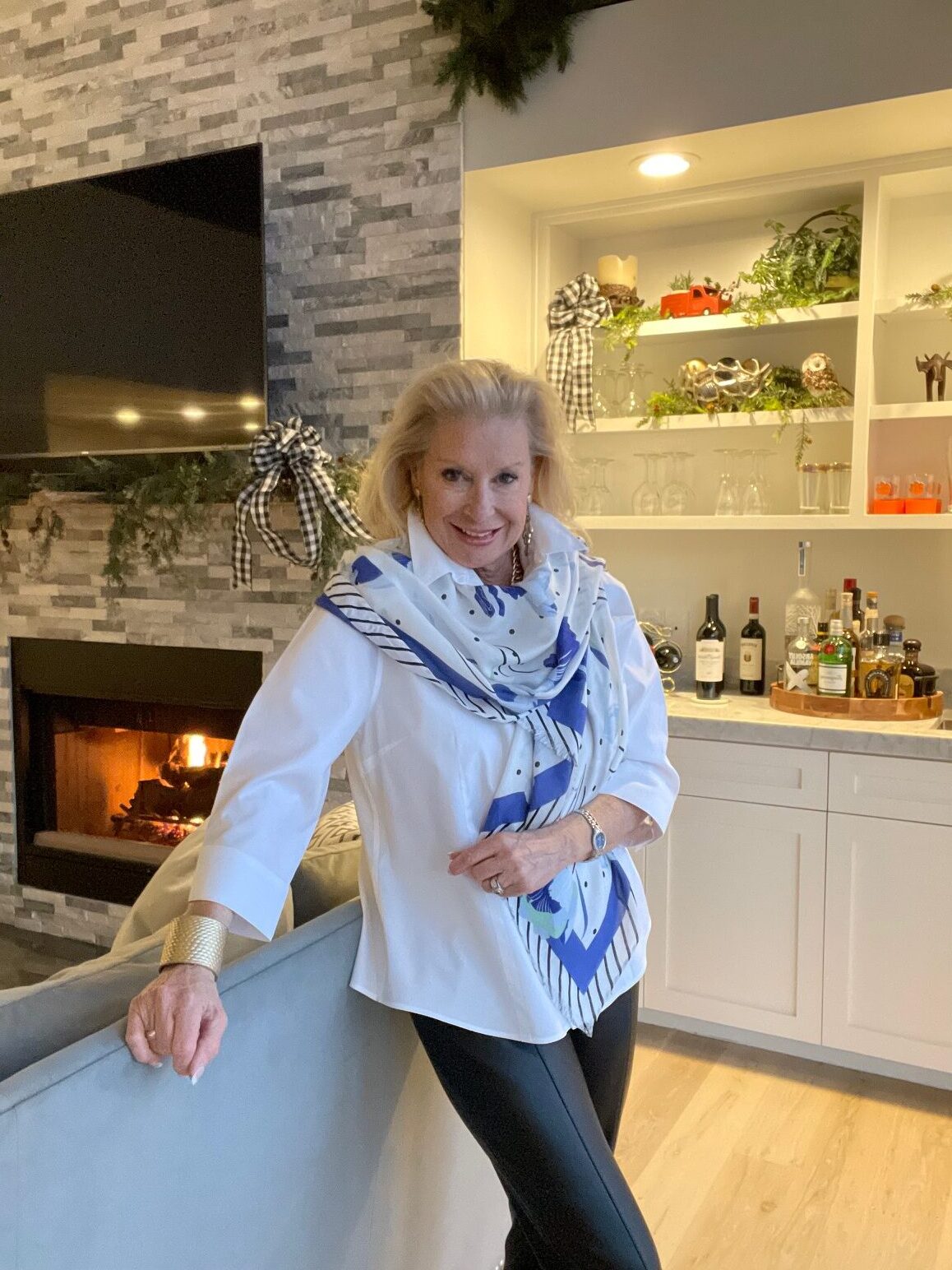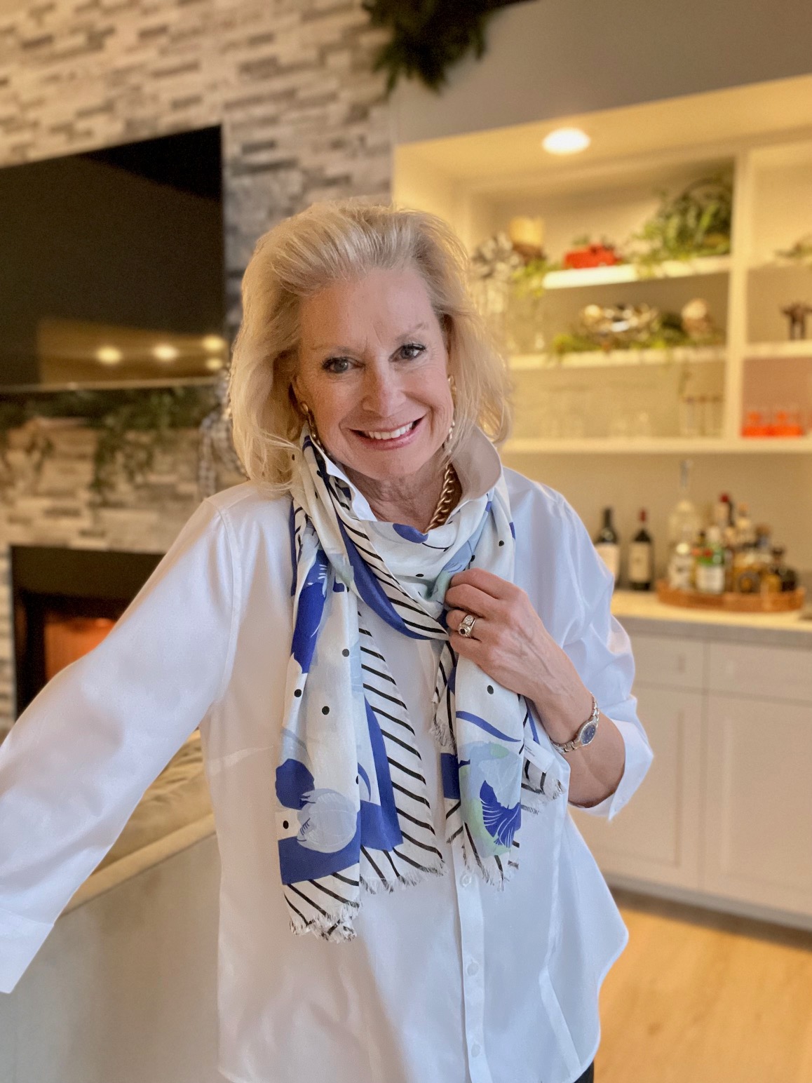 I purchased this scarf from Talbots a couple of years ago because of the periwinkle color. It’s such an elegant scarf that looks good worn so many ways. Here’s a great article on how to tie a scarf.
