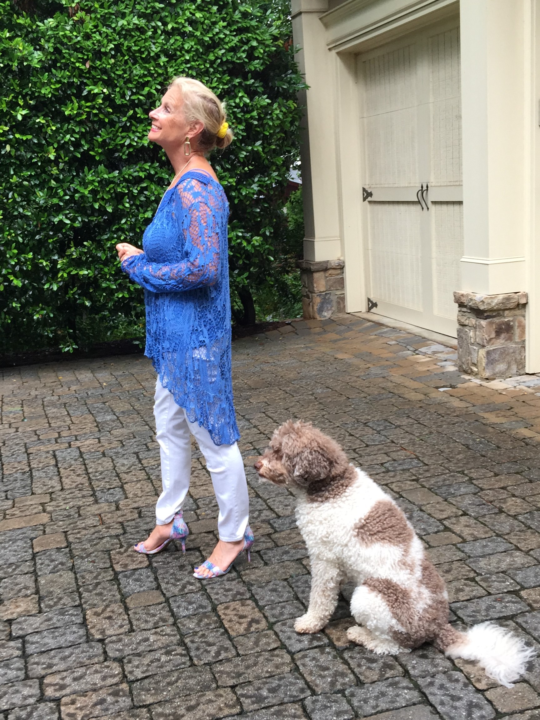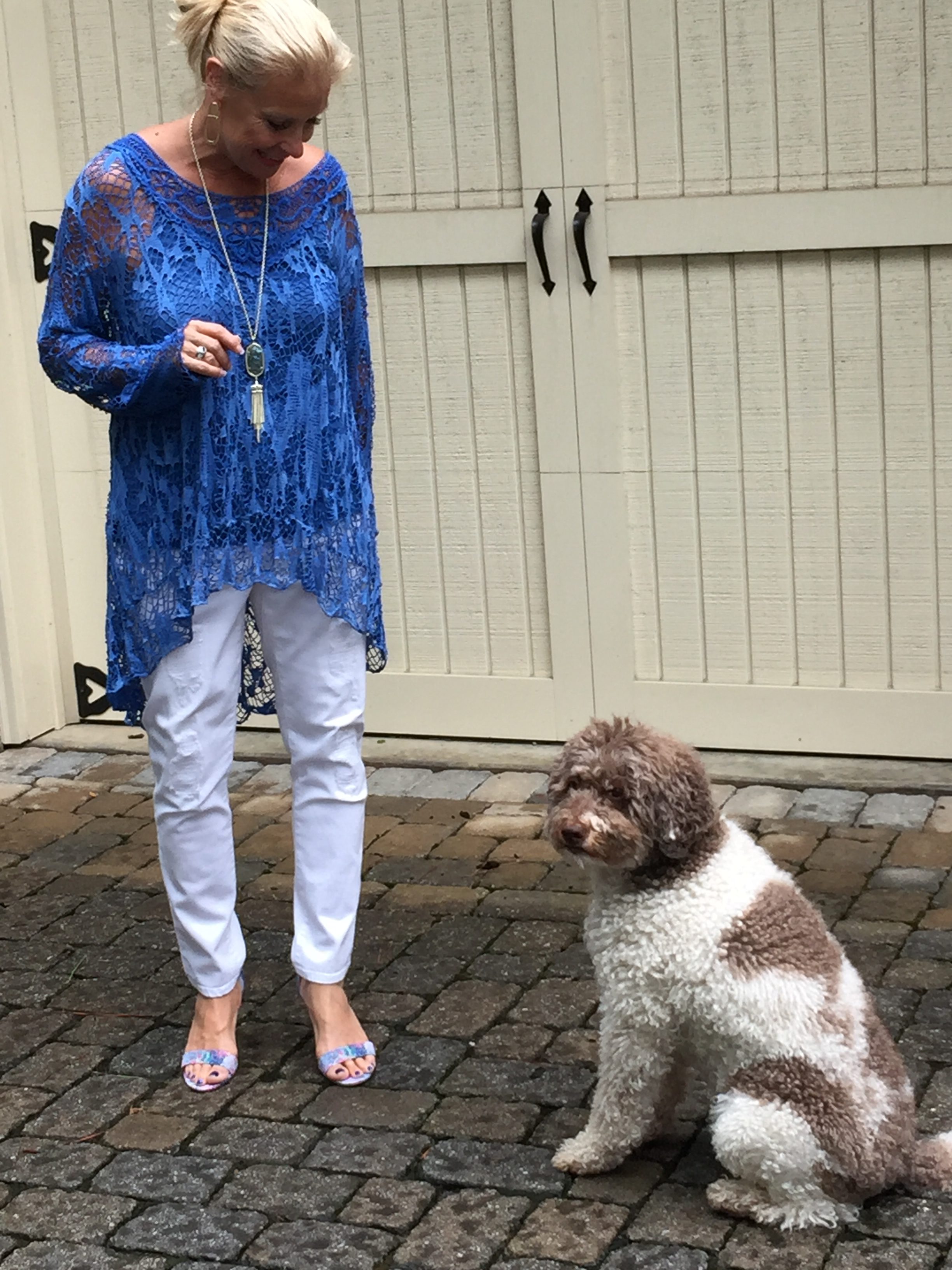 I wasn’t planning on showing you my yellow scrunchie and my skinny jeans caught in the heel of my sandals (Over 40 fashion nono) but this was a good shot of the angled lace top. I guess I need to hire a stylist for my photo shoot to make sure everything looks perfect!