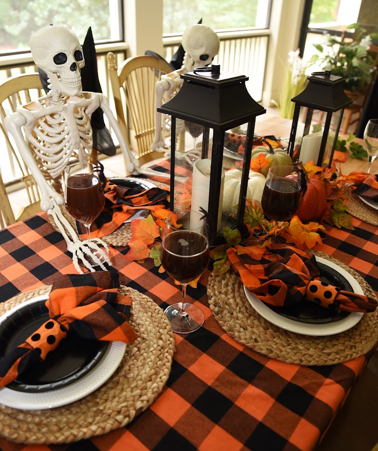 I ordered 2 lifesize skeletons and the orange and black buffalo checked tablecloth and napkins from Amazon.