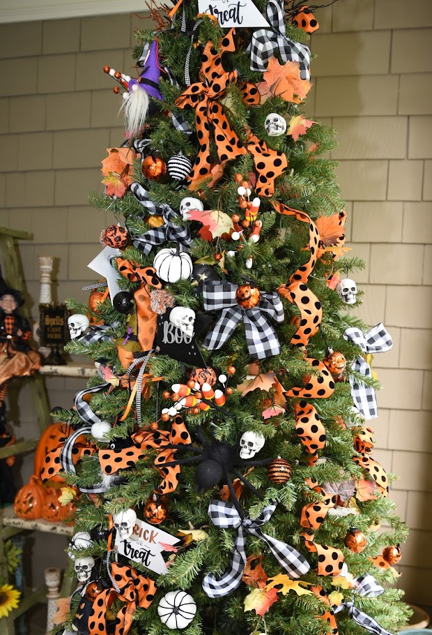 I am doing a Christmas collaboration with the King of Christmas that I will share later but how fun is this Halloween tree! So I immediately went to Michael’s for the ribbon, the picks in the tree, the decor that you see behind the tree on the shelves, and Amazon for the ornaments. I have to say that I was a little disappointed that I couldn’t find larger ornaments for the tree.