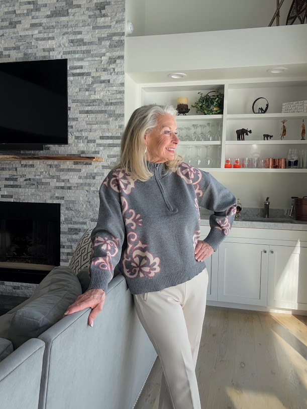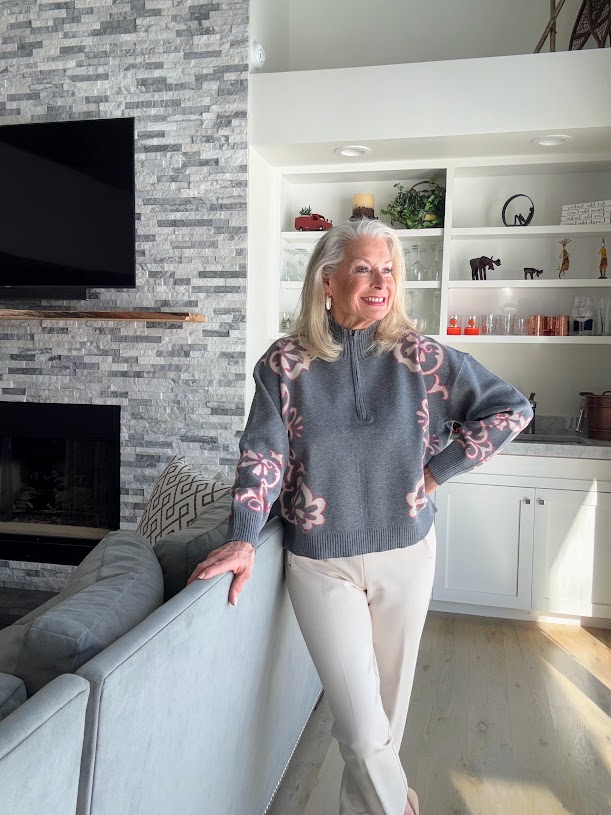 When I reviewed the Montana Mock-Neck Half-Zip Sweater by Maeve from Anthropologie, it was the most-viewed video on Instagram. The sweater comes in a variety of prints, but I really liked this gray and pink motif. I paired the sweater with Chico’s Juliet Ponte Trim Detail Ankle Pants in English Cream.