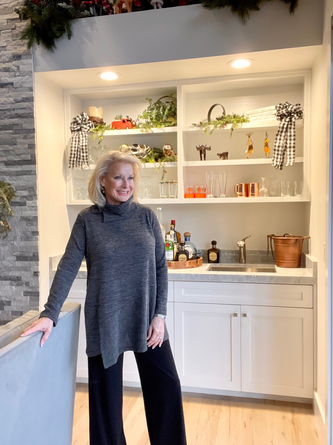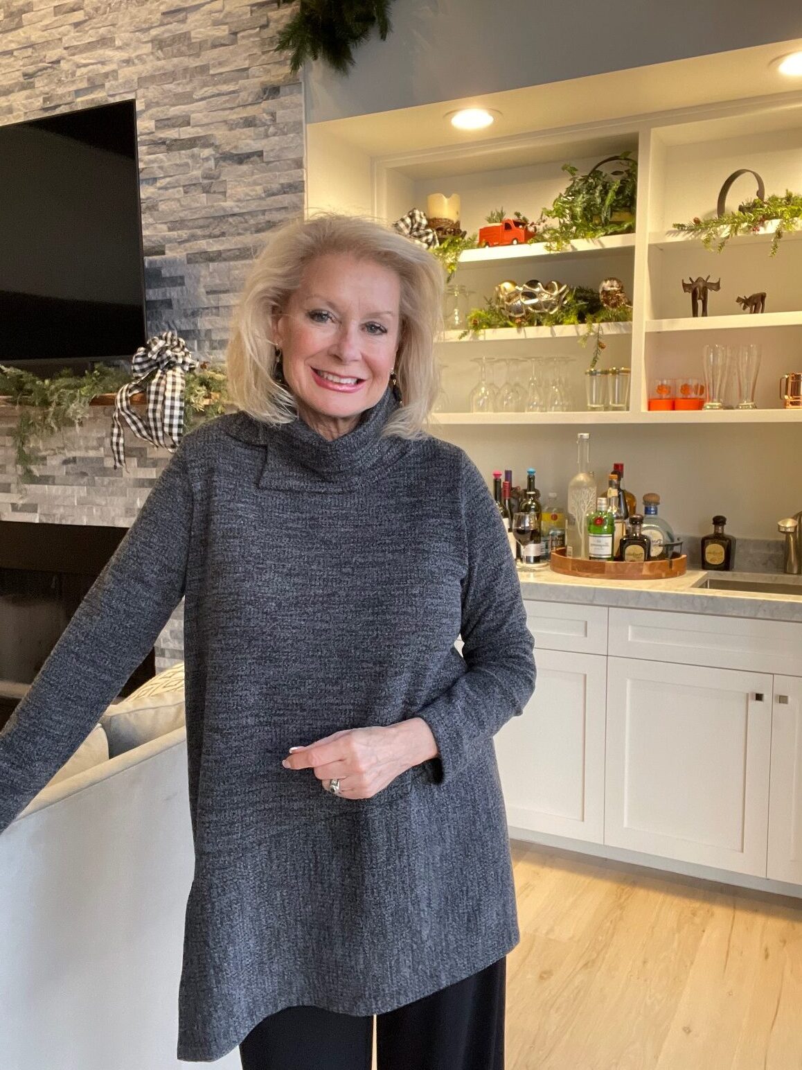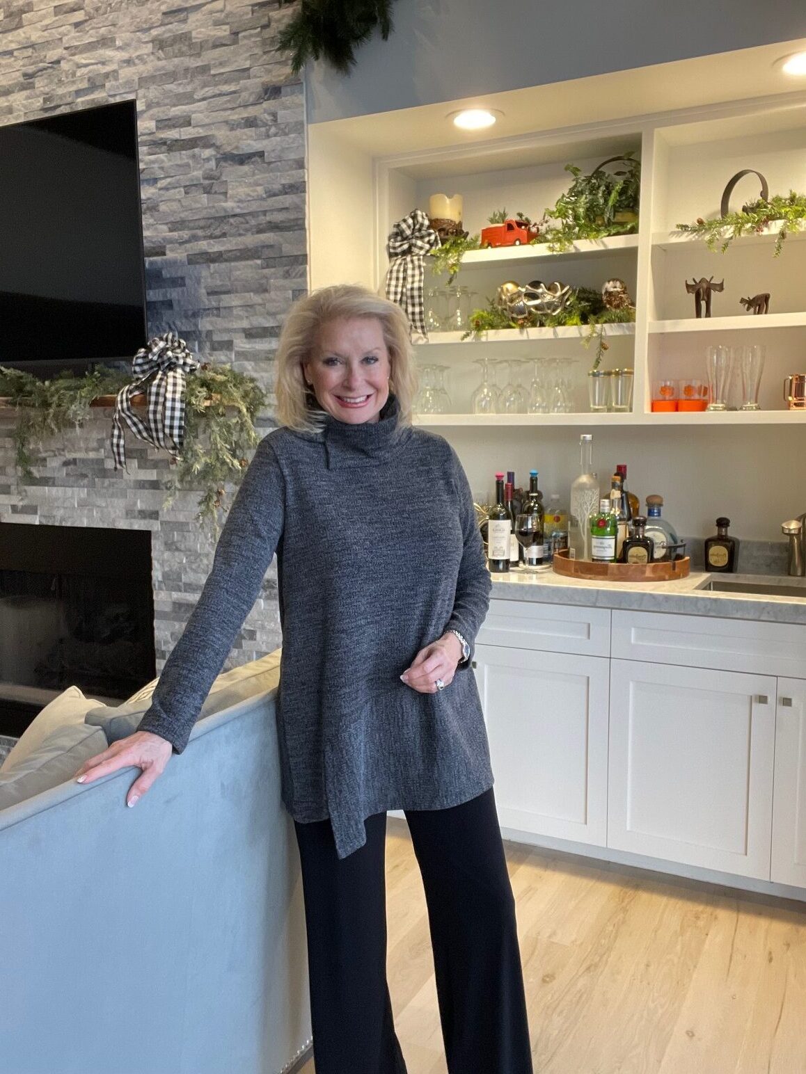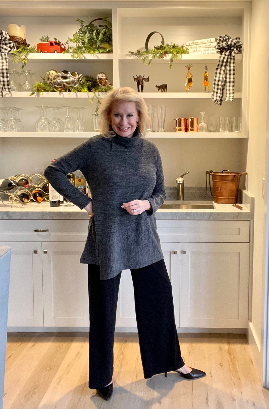 Clara Sunwoo has a fabulous collection of wide-legged pants, and I’m wearing the Wide Leg Pocket Pant with the sweater tunic. These pants feature two side pockets on the front. I can’t begin to tell you how comfortable these pants are! The pants are wrinkle-free and travel-friendly too.