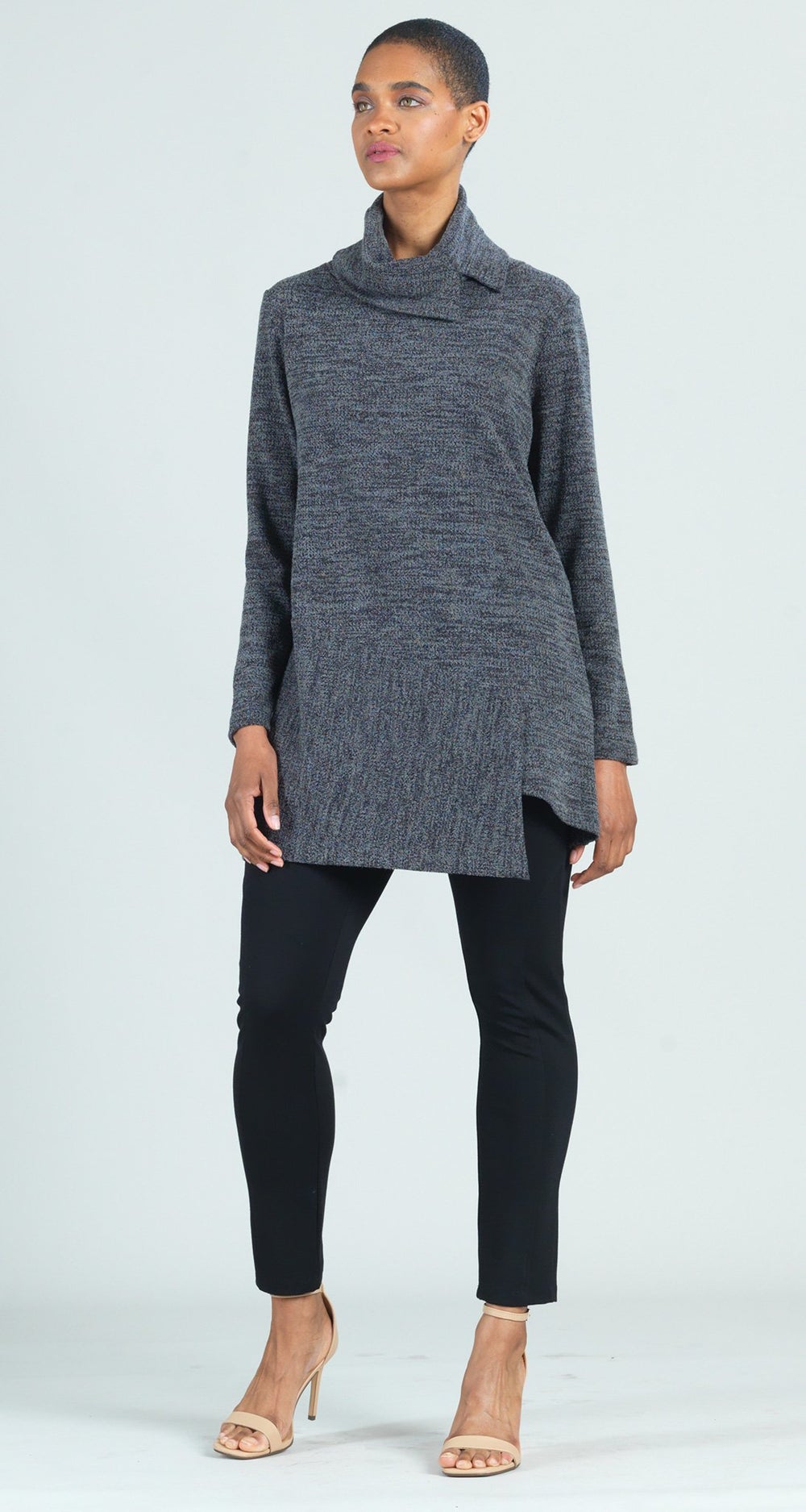 The tunic sweater has a diagonal, lower right waist seam that flatters the body and an angled hemline.