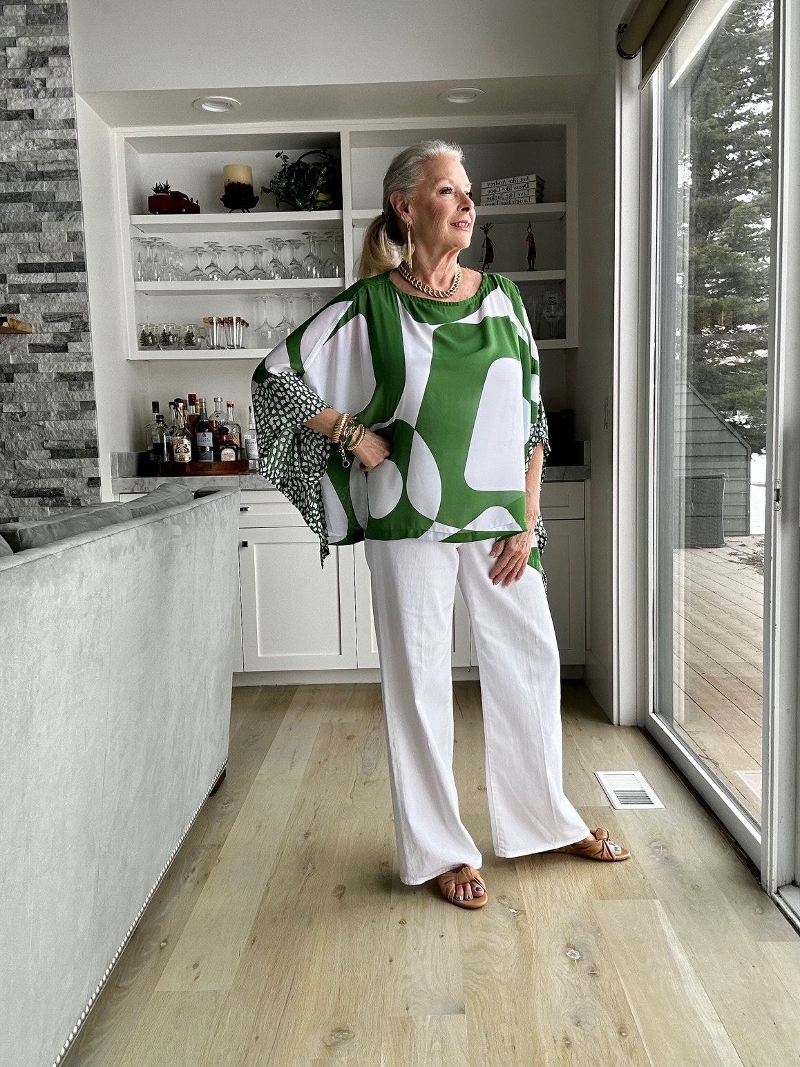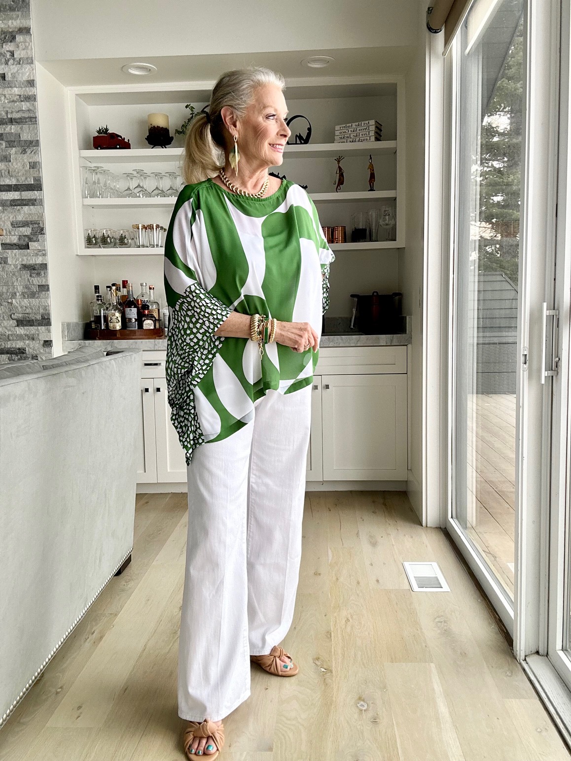 Since it’s St. Patrick’s Day, I am wearing this fabulous green poncho that I featured last year for my spring vacation. I am wearing the poncho with Chico’s High-Rise Wide-Leg Jeans, which are one of my favorite pairs of jeans. They are worth every penny!
