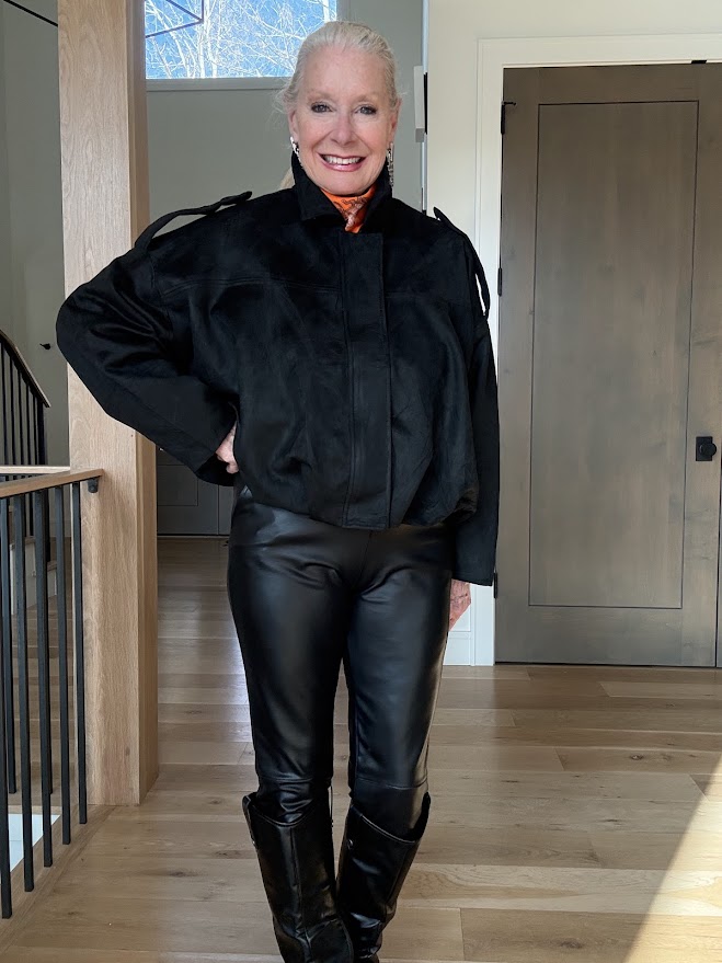 Wearing: Jacket,scarf,  and boots are from Amazon.  The Faux Leather Pants are old.