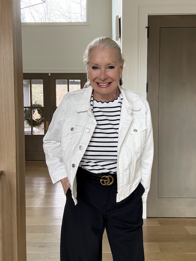 Wearing: White denim Jacket, Striped Tee, Gucci Belt, and black barrel-leg pants.