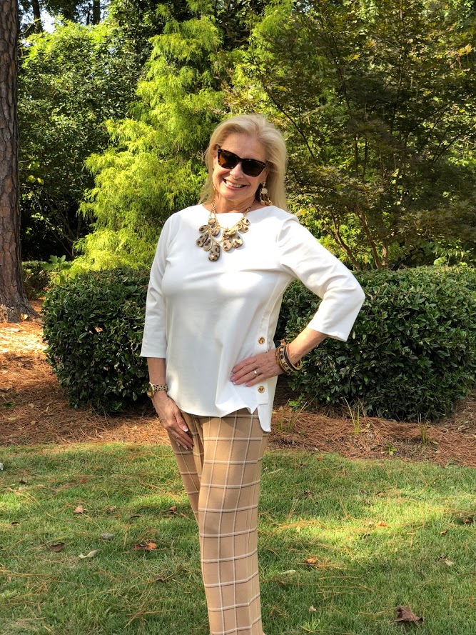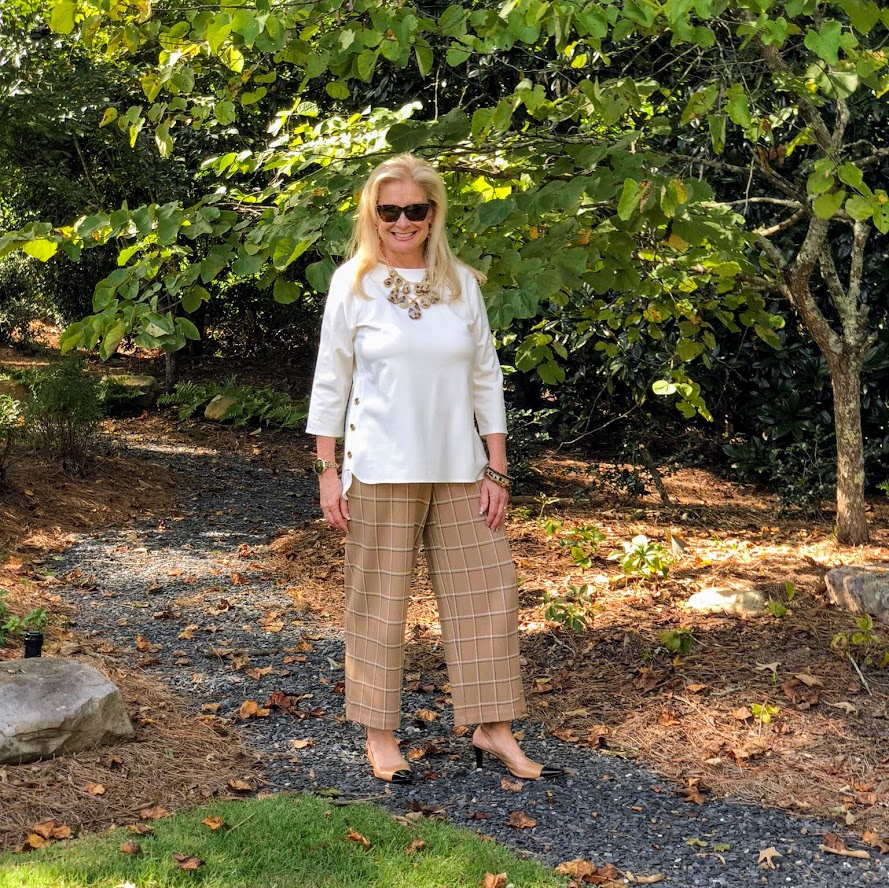I am loving the neutrals, especially this time of the year. The tunic, pants and necklace are fabulous. I love cream and tan, together!