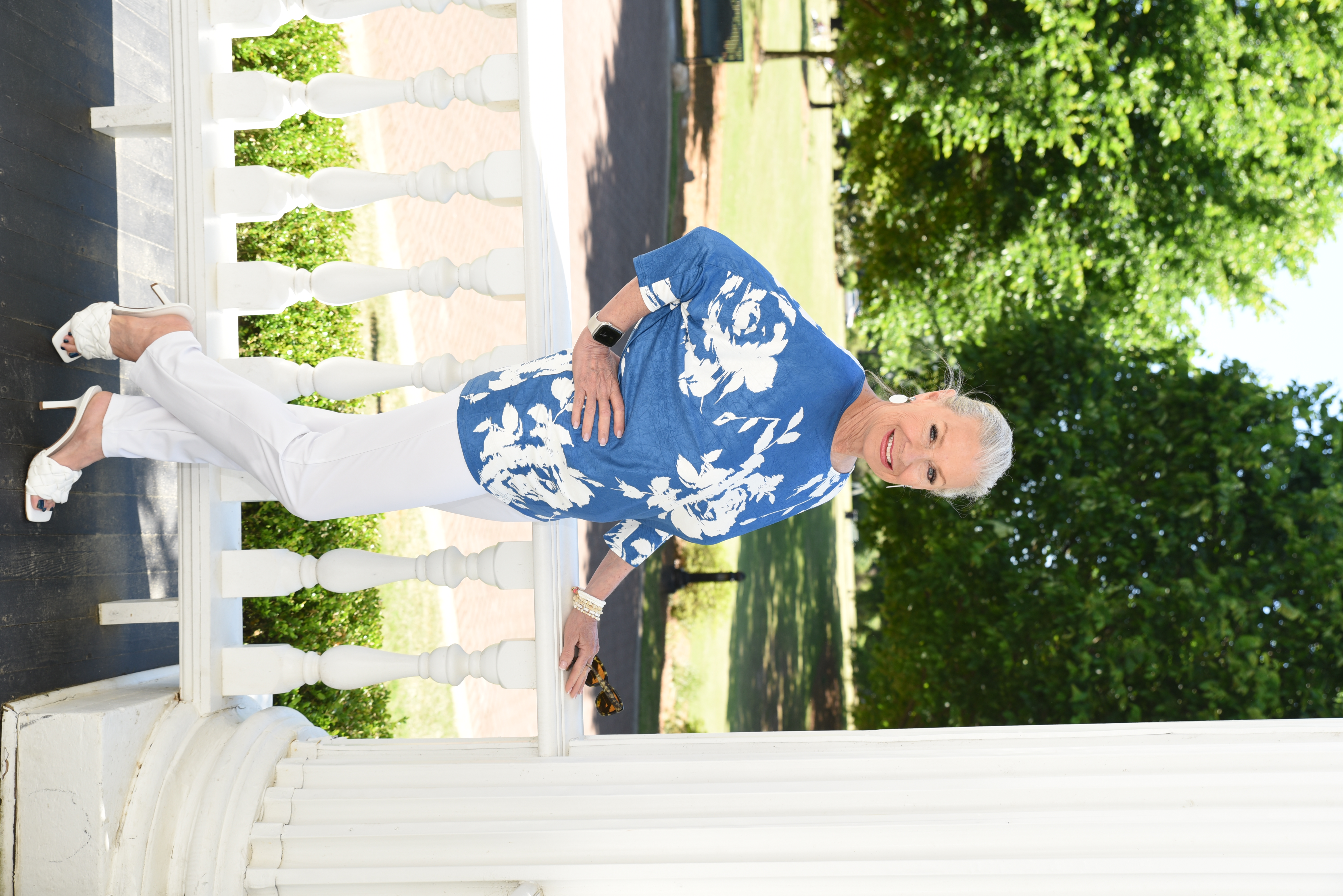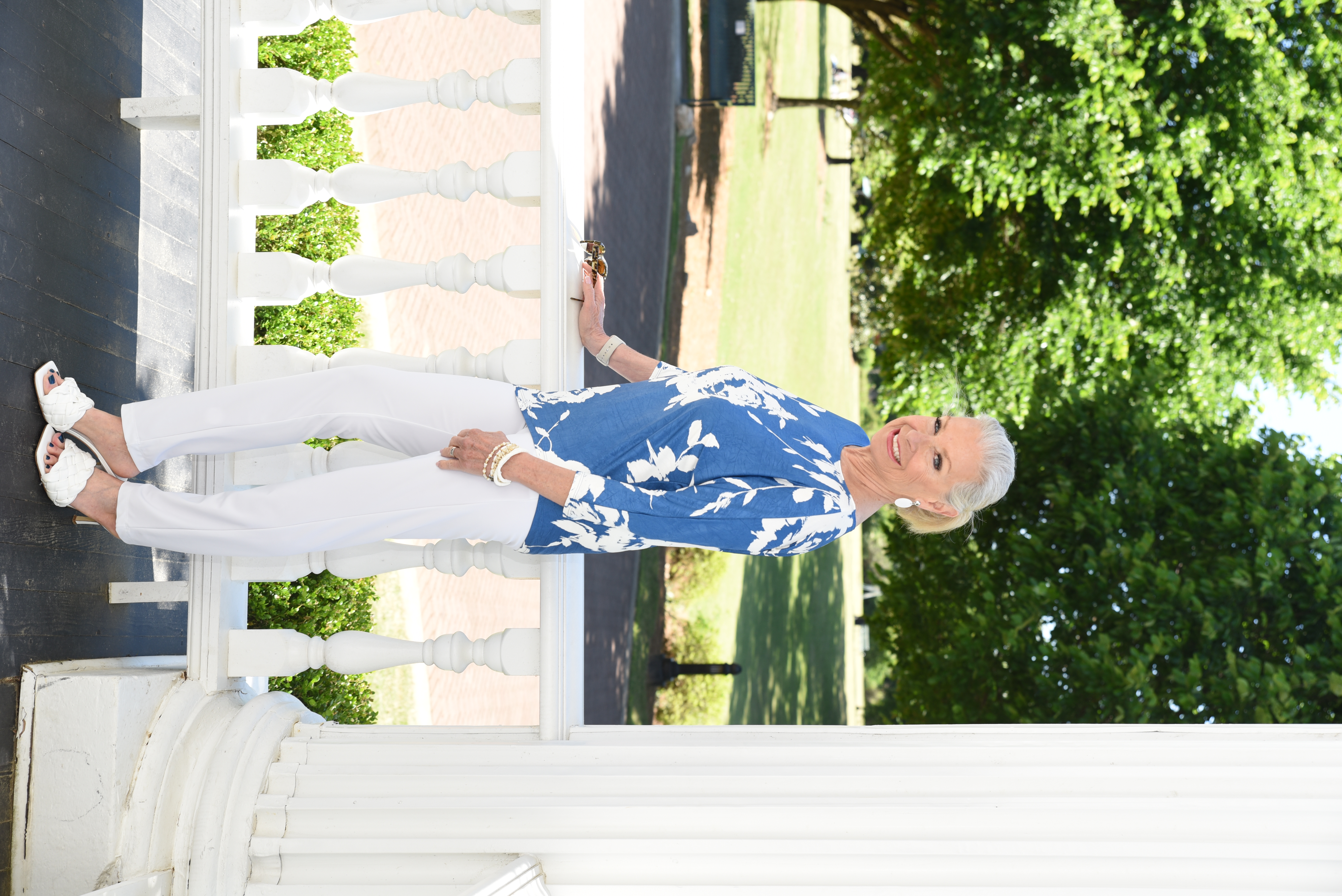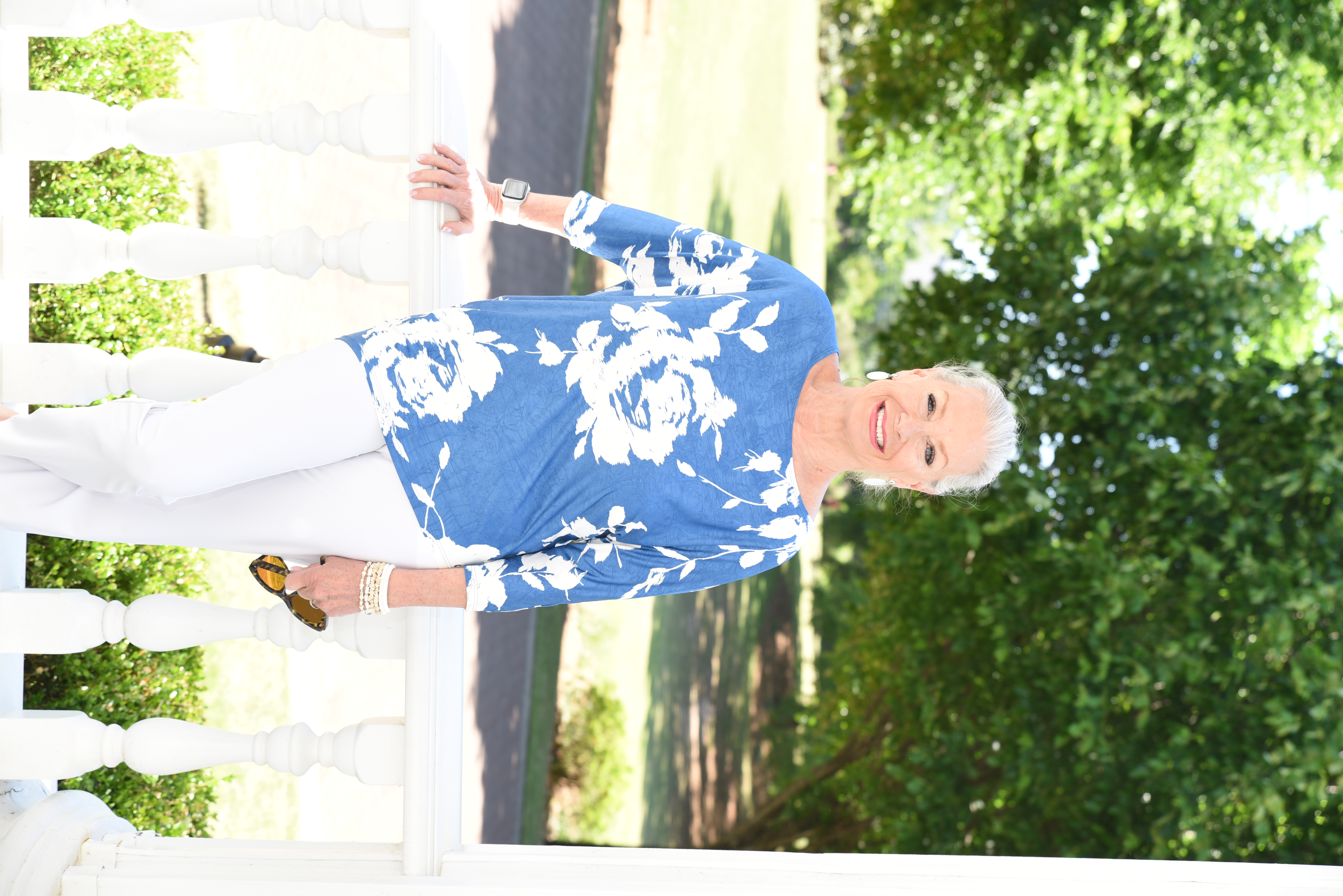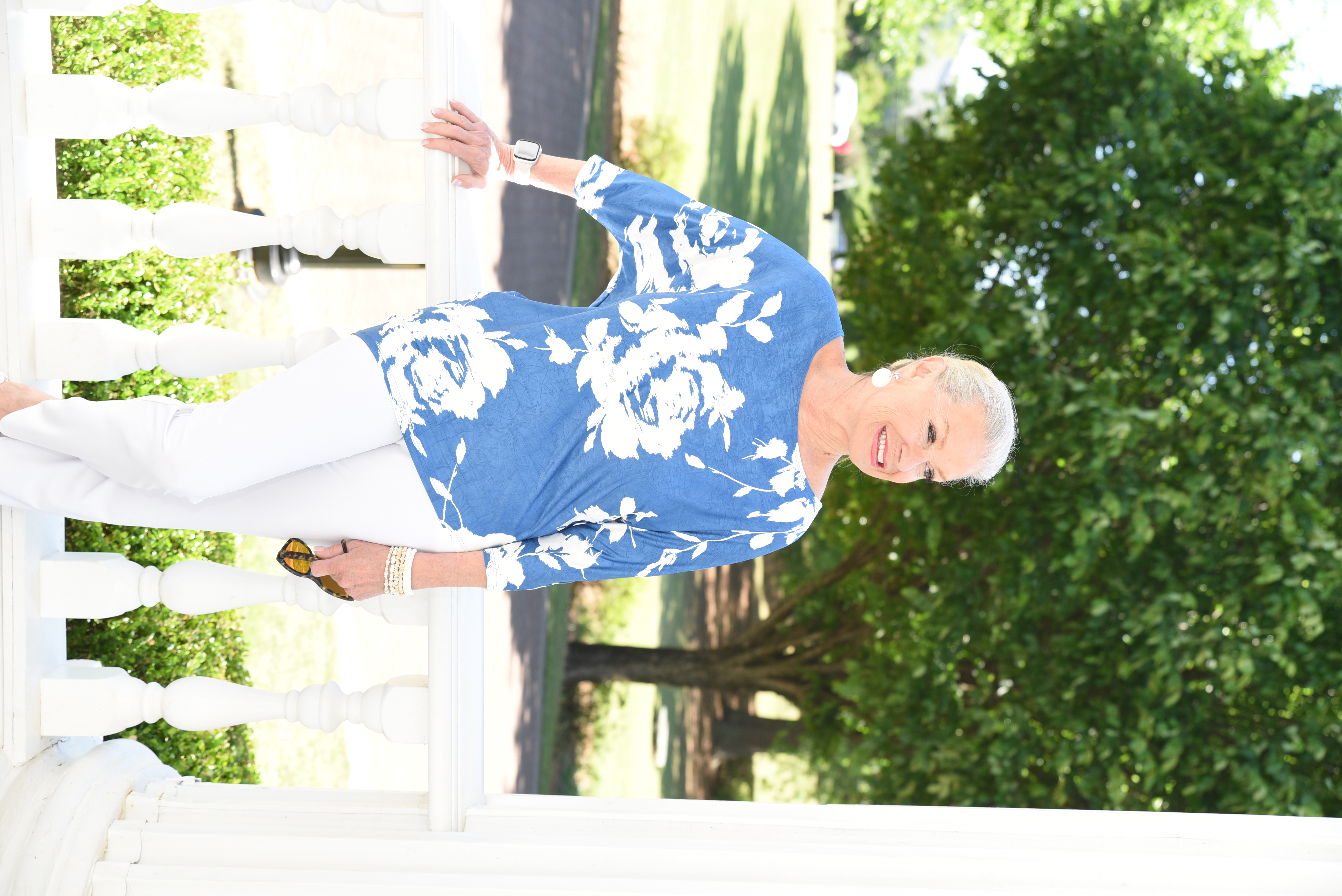 I enjoy working with brands like Clara Sunwoo who designs stylish and chic outfits for midlife women. You have seen me wear their clothes in many posts because I always feel stylish. However, comfort is also another criteria when I am working with a clothing brand. I am wearing Crush Silk Knit – Half & Half Sleeve Top – Dreamy Floral-Blue with the Medium Knit – Straight Leg Pocket Pant in white for this post. The BOLD floral print is what got me thinking about writing a post about being BOLDER after 60.