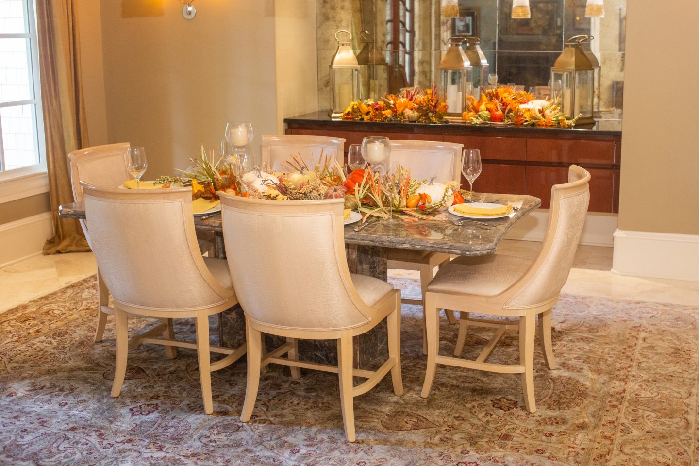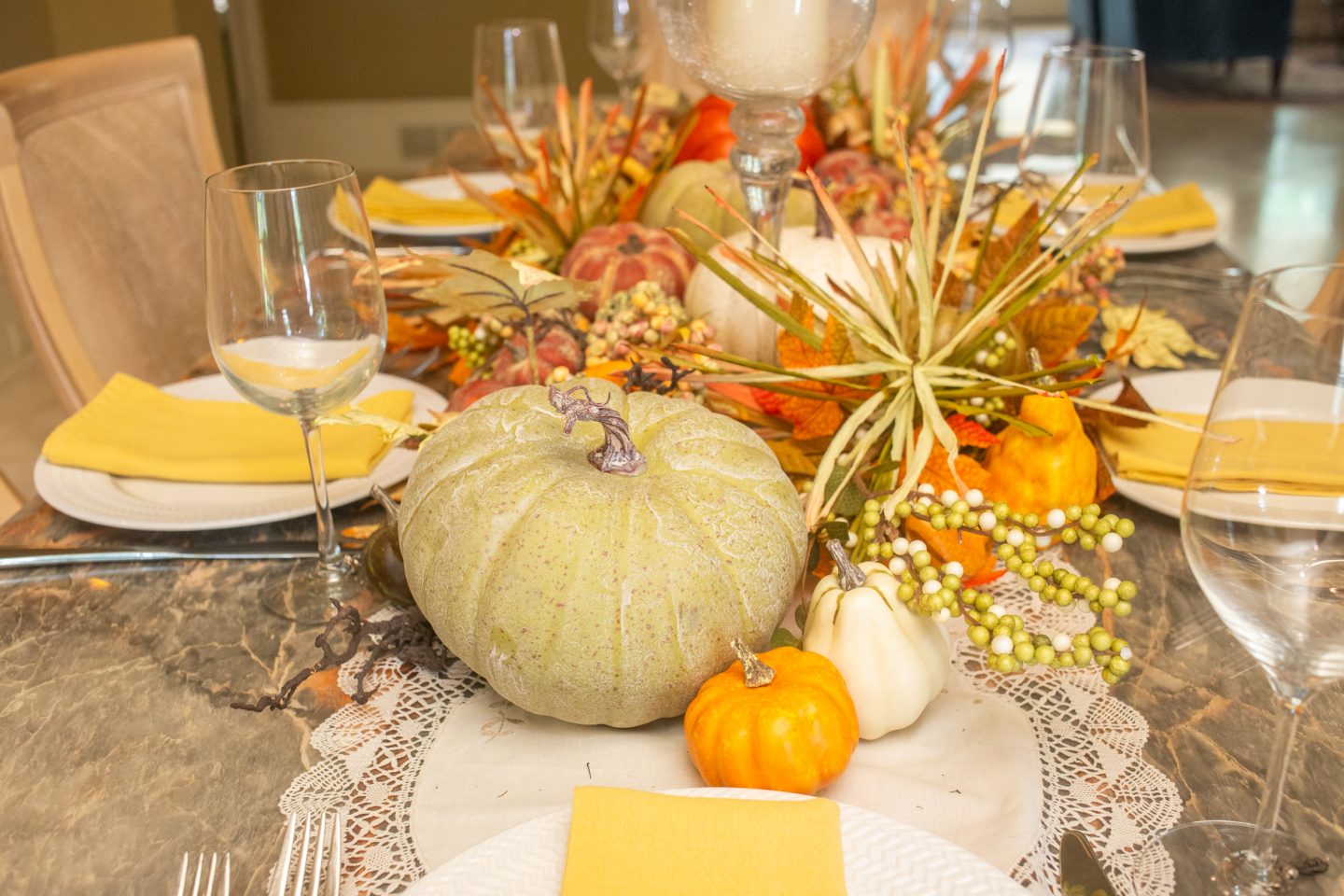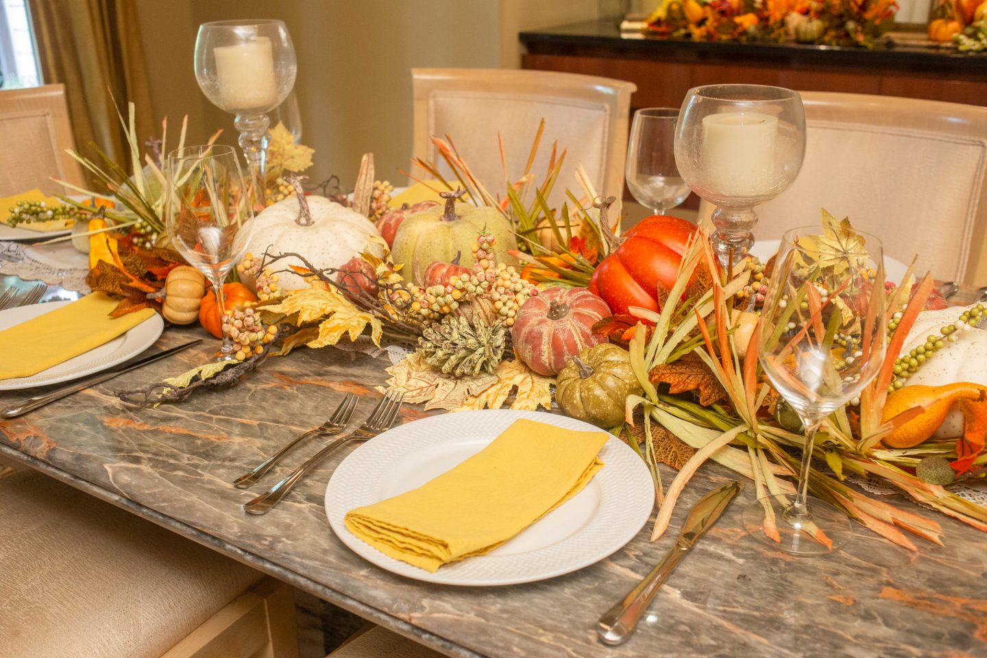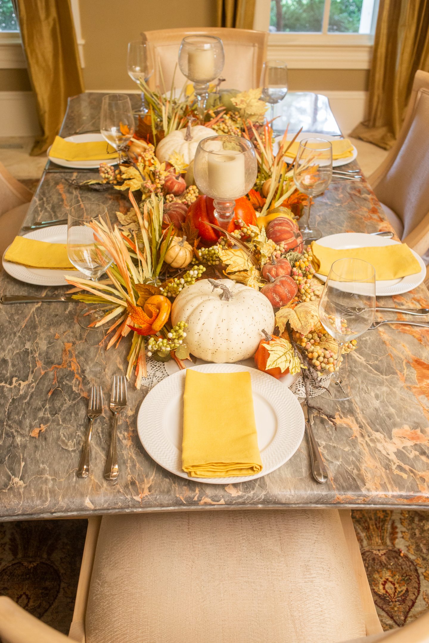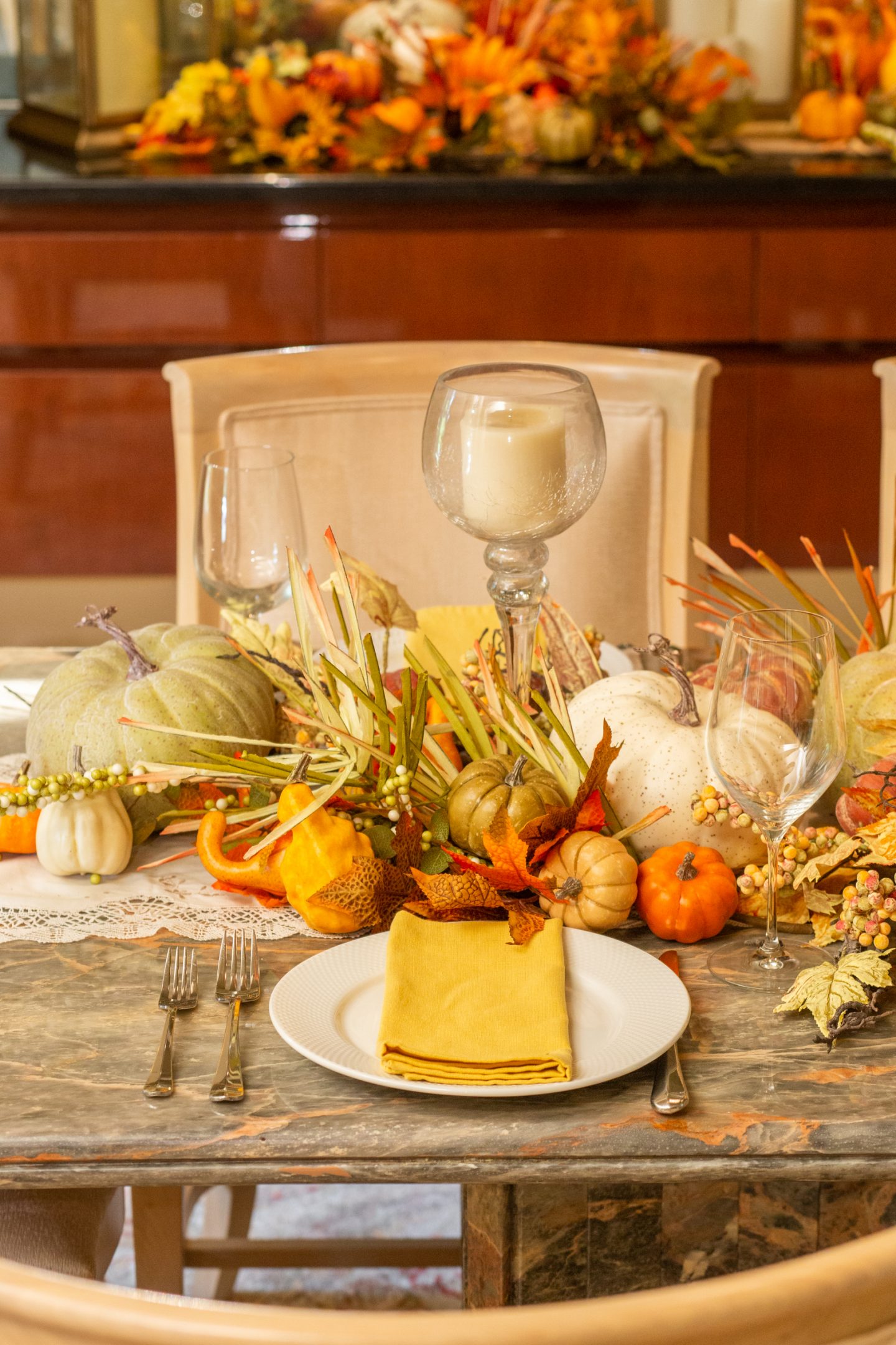 Every year I change up my tables using different fall decor from Michaels, Home Goods, Pottery Barn, and wholesale resources. I find buying faux decor in the long wrong so much more economical than purchasing pumpkins, gourds, and corn stalks at a store. I love reusing them year after year!