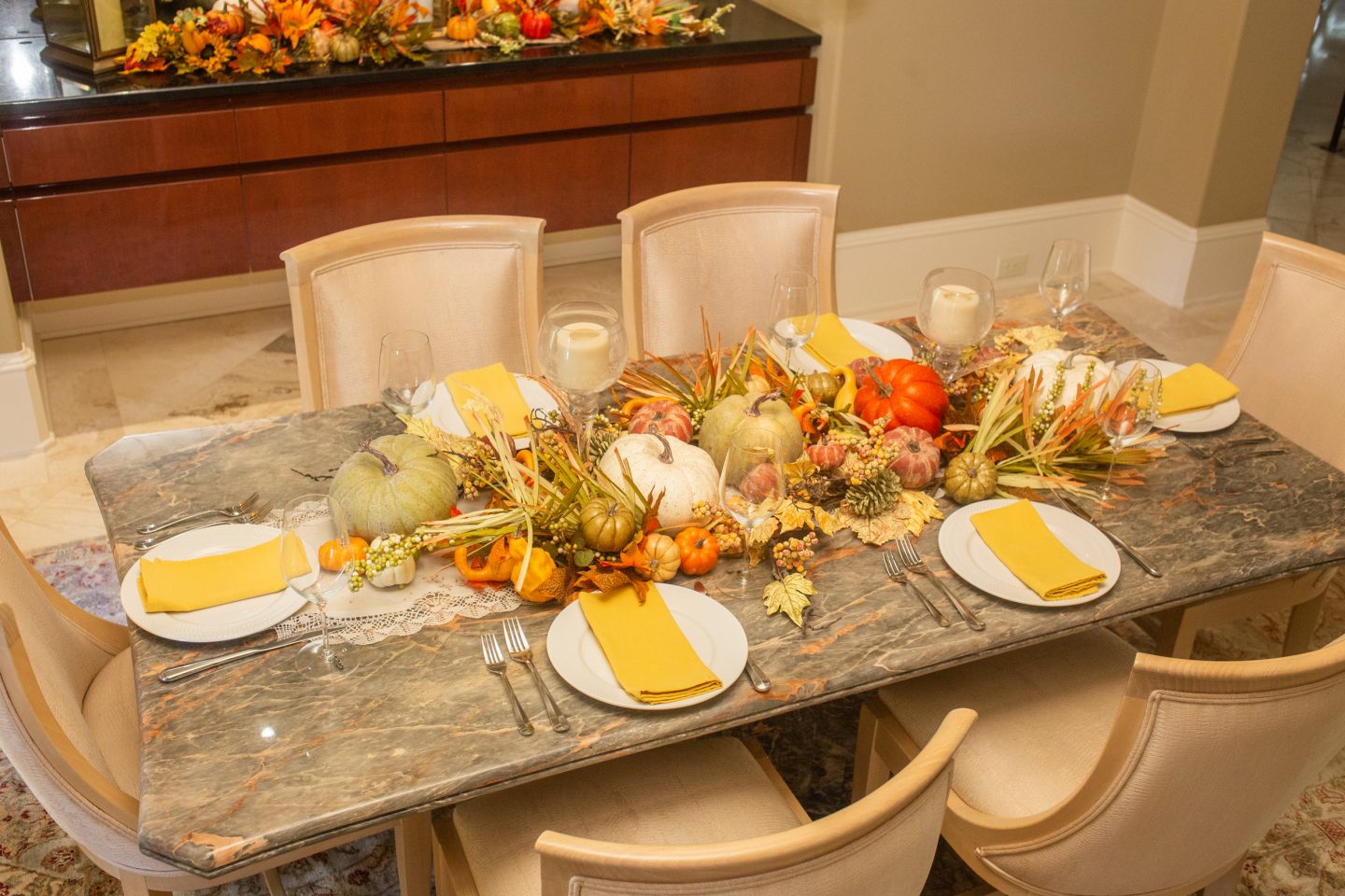 Robin, Your decorations looked beautiful. What a way to show your guest how special they are. Also did I see that your from Iowa…That explains the harvest decor. I love using real squash, pumpkins and gords on out table too.