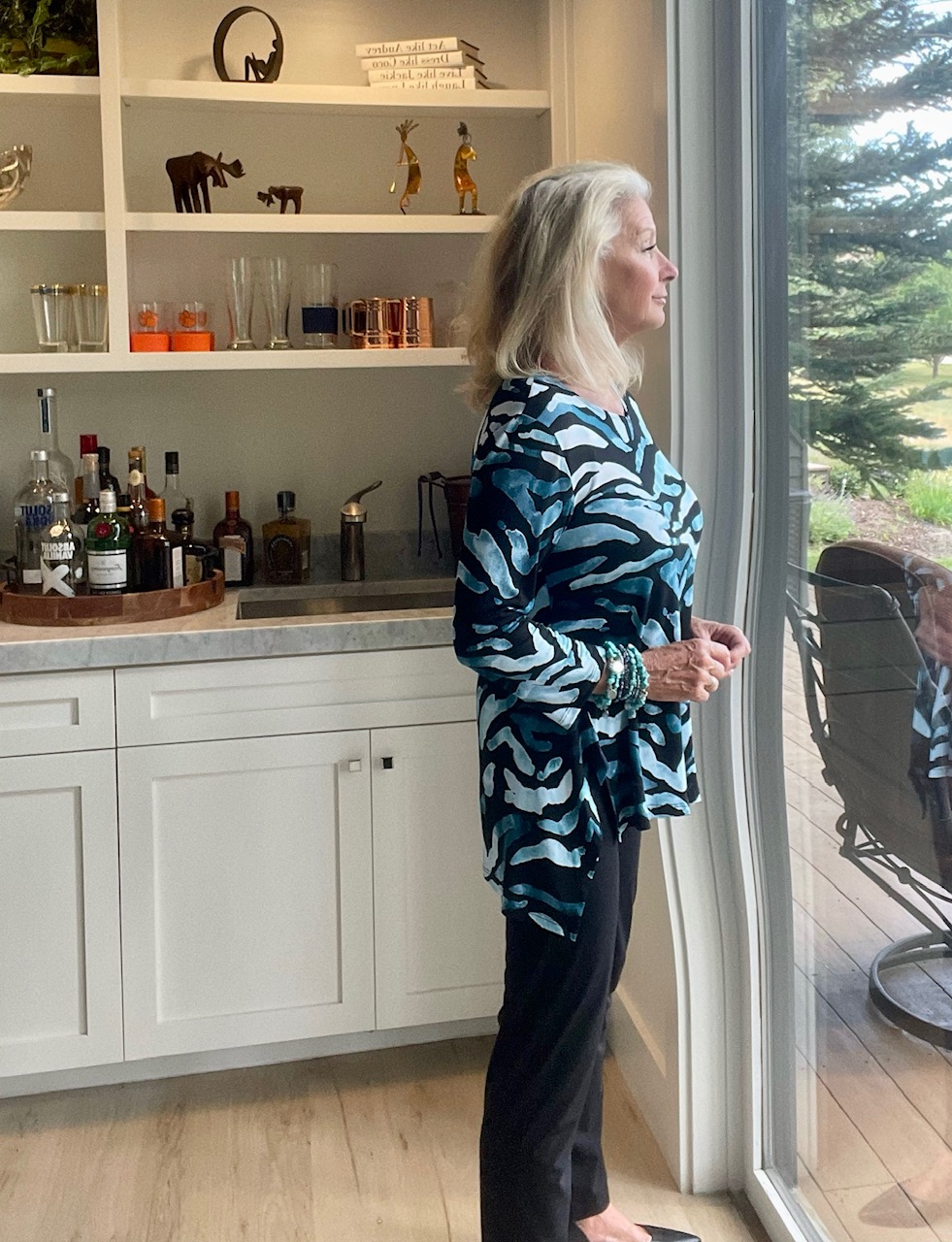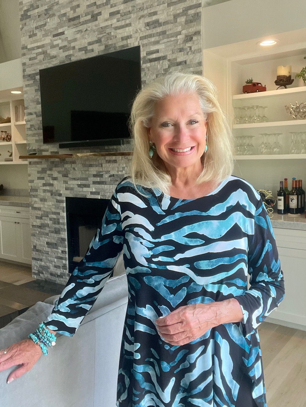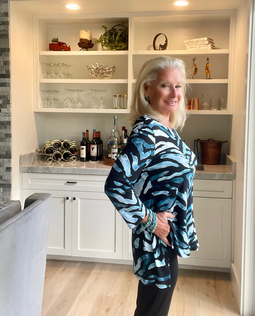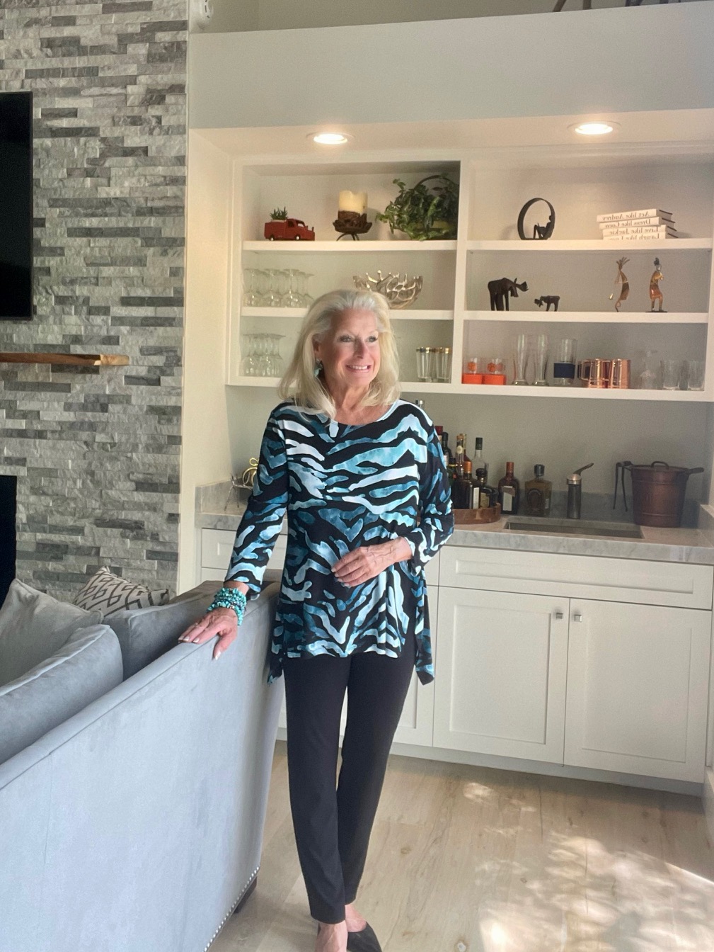 I had to show you a side profile of the tunic. It would help if you saw the high and low lengths of the tunic. I am very busty, so my side shot doesn’t apply to everyone. However, I want to show you my authentic profile. For sizing purposes, I am wearing a medium size.