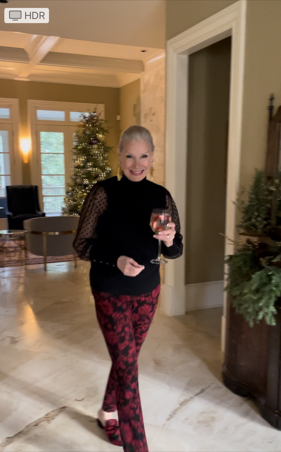 The floral damask print pants feel good and add glamour to your holiday wardrobe and beyond. You can wear them again for Valentine’s Day! The pants fabric is made with the So Slimming® Hidden Fit technology that is stomach slimming and smoothing.