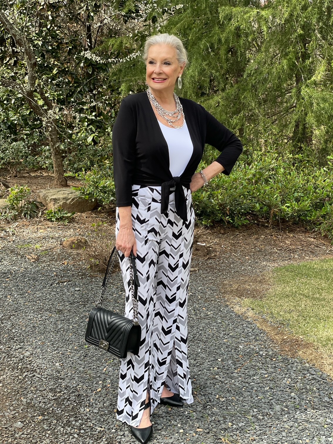 I am such a big fan of Clara Sunwoo’s Kick Front High Slit Pant. This time I’m wearing the Chevron Stripe. You have seen me wearing the black colored Kick Front High Slit Pants in this post.
