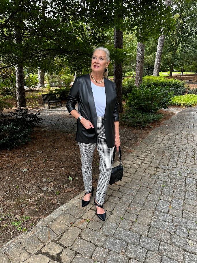 You can add a black blazer and a white tank top with the pants. I am wearing a faux leather jacket that I have worn before in this post.