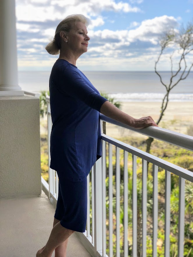 I selected this ink blue leisure suit that can be worn for the daytime or as pajamas. I am wearing a medium and it fits me so well and is very comfortable because of the Micro Modal fabric which is super-soft, luxurious, and oh so comfortable! I like the high scoop neck on this outfit for better coverage. It also comes in a V-neck style too.