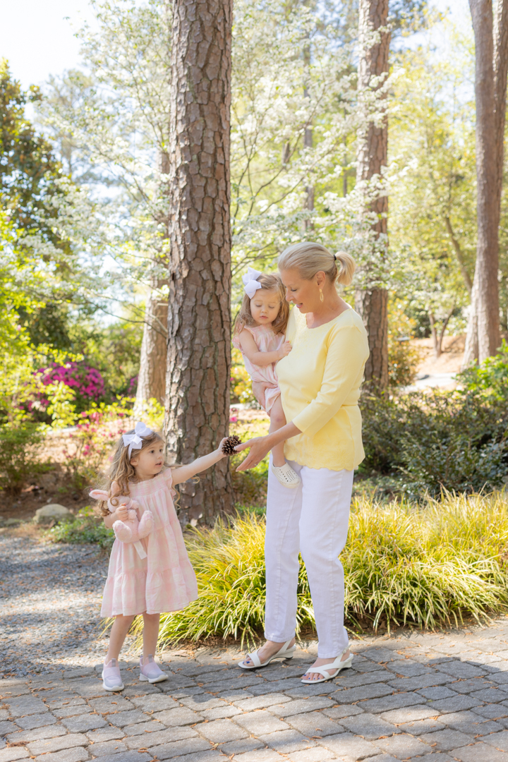 I am wearing the Floral Garden Embroidered Top in yellow. It also comes in a pretty blue. You can’t see the embroidered details of the shirt, but it is really lovely. For sizing purposes, I am wearing a size medium in the top. I am again wearing Draper’s and Damon’s Slimtacular® Straight-Leg Pull-On Pants that I wore last spring in this post. I love the way these pull-on pants fit! The pants come in six colors. Again I am wearing a medium in these pants.
