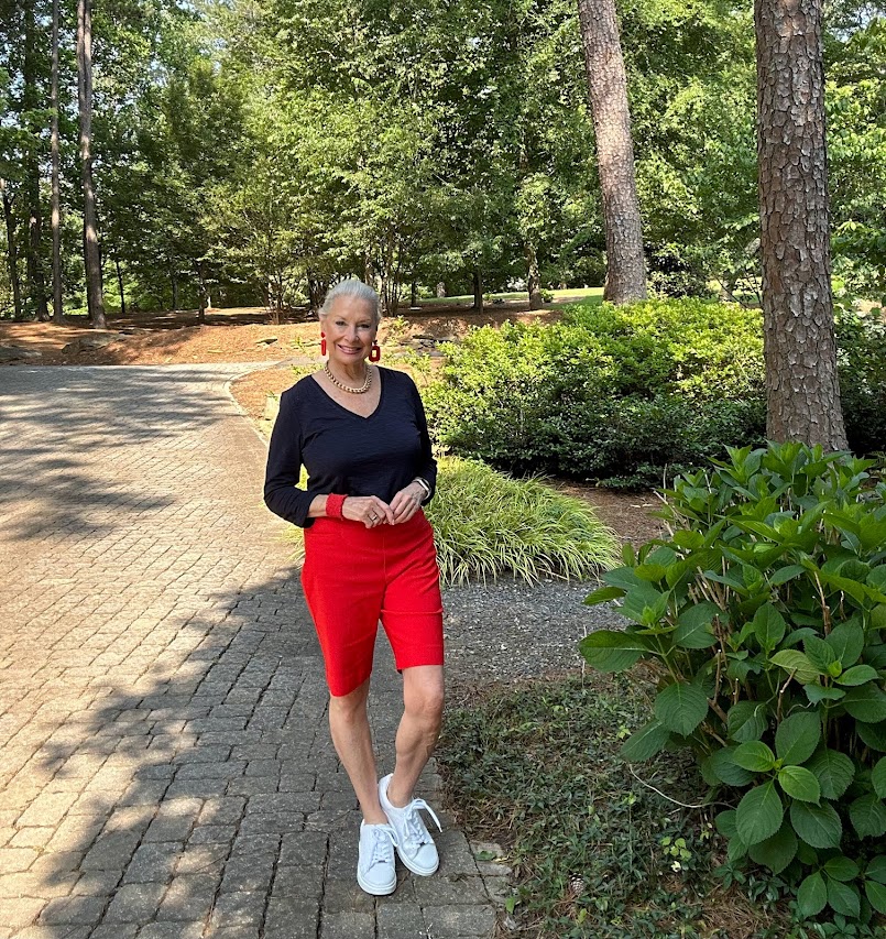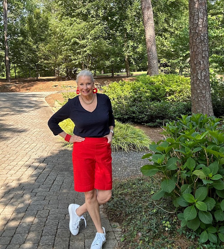 I was given this outfit from Chico’s for the Memorial Day Sale that’s going on now until Monday. Since it is going to be Memorial Day weekend, I selected to wear the navy blue 3/4 Sleeve Slub Tee to go with the scarlet red So Slimming Brigitte 10″ Shorts. I love the length of these shorts! I now have 4 different colors in these shorts for summer. So comfortable and CHIC!