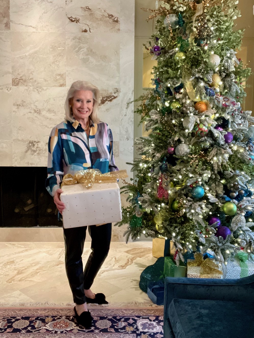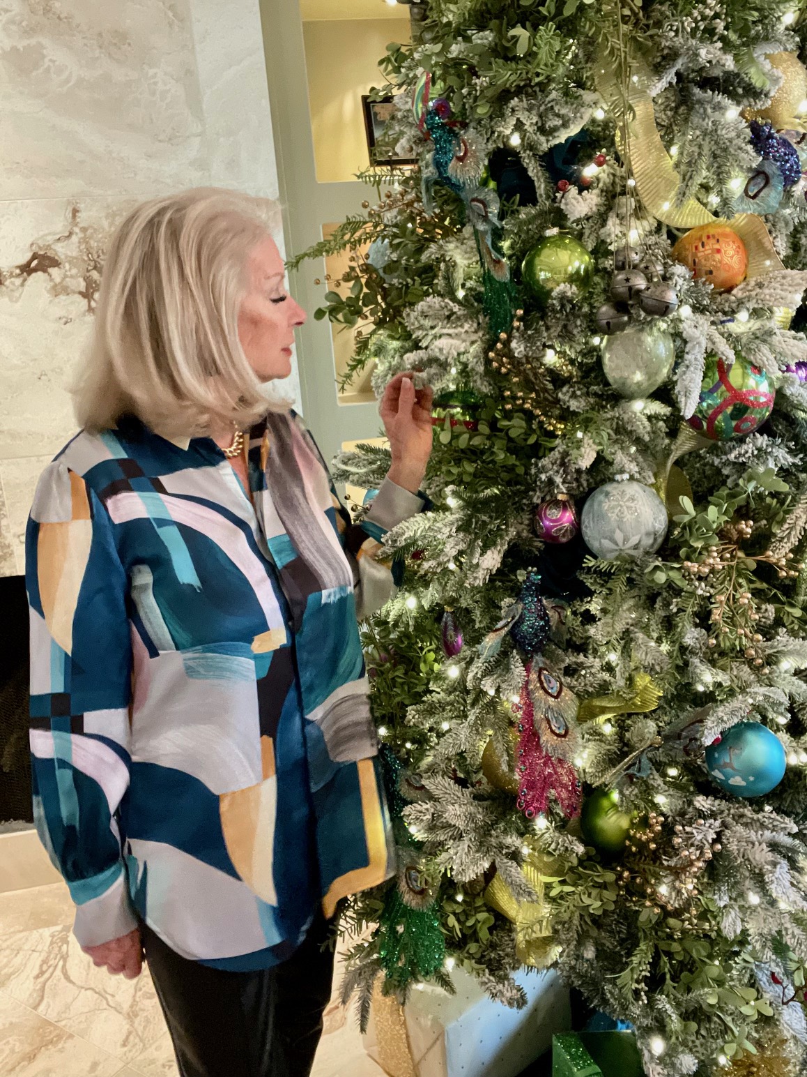Since we’re having Christmas after Christmas I decided to wear this gorgeous abstract print tunic for our family celebration. I paired it with faux leather leggings but it will look fabulous with colored jeans that I have in my closet. You can wear the tunic now and also this spring. Such a beautiful top!
