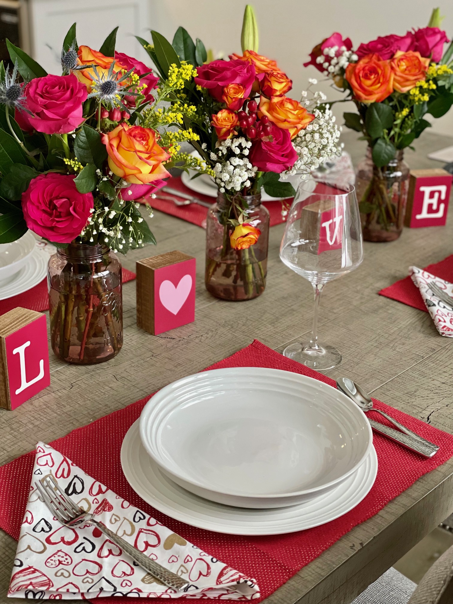 I purchased my placemats, napkins, and Valentine’s Day blocks at Home Goods. I always shop there for fun little things. The flowers are from Smith’s here in Park City.
