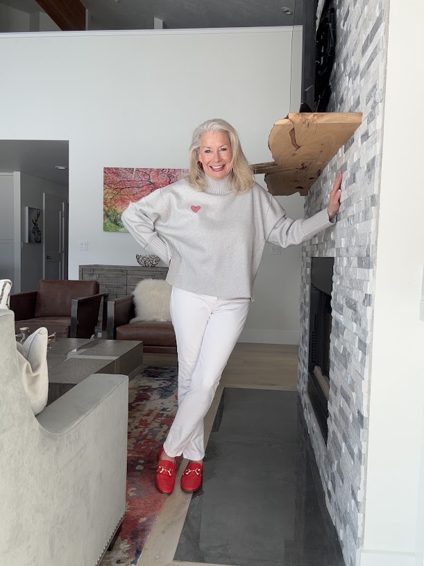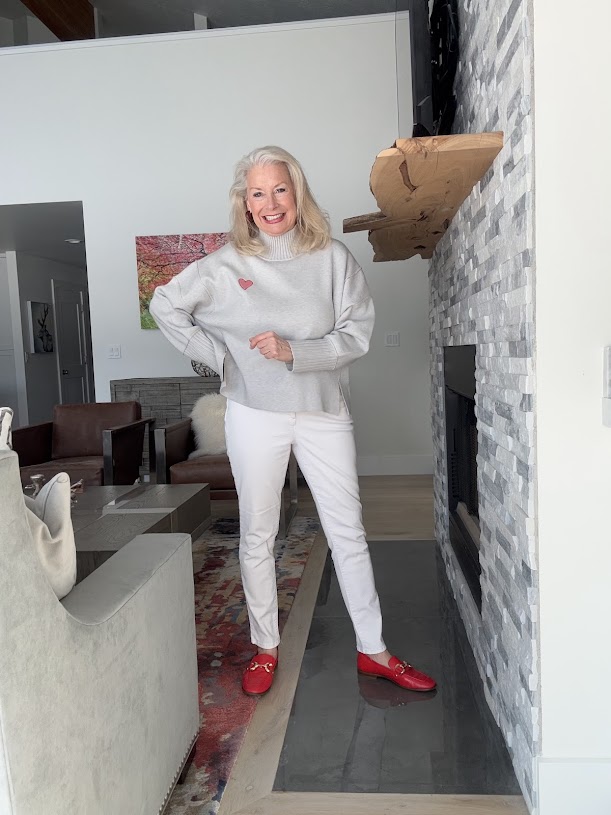 The Logan Turtleneck Sweater by Maeve features an embroidered heart and comes in eight colors. I am wearing a size medium for this top. Pair this top with white jeans for a simple solution to everyday looks. My red Harlow Bit Loafers from the Patricia Green Collection is the perfect pop of red.