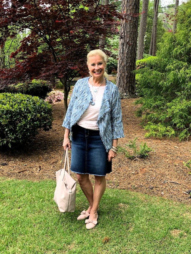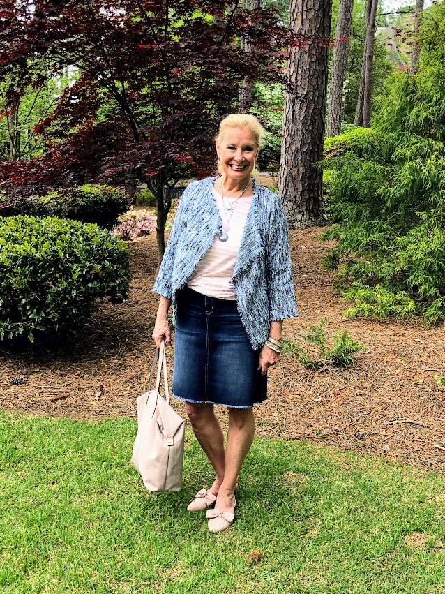 I love this denim skirt I selected to wear for this collaboration. It has a lovely length and I love how flattering it looks on me. The tweed jacket can be dressed up or down and tweed jackets are trending this year! Now I have 2 tweed jackets to style in 2019! I just recently shared my vintage tweed jacket here.