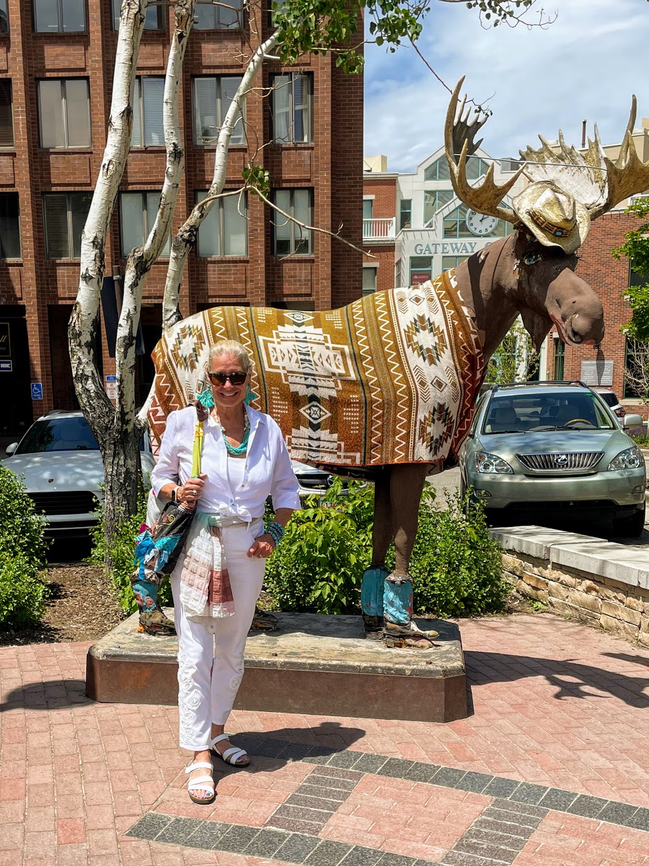 Below I am wearing another scarf I purchased in Park City, standing next to Loosey the Moose, a Park City landmark.