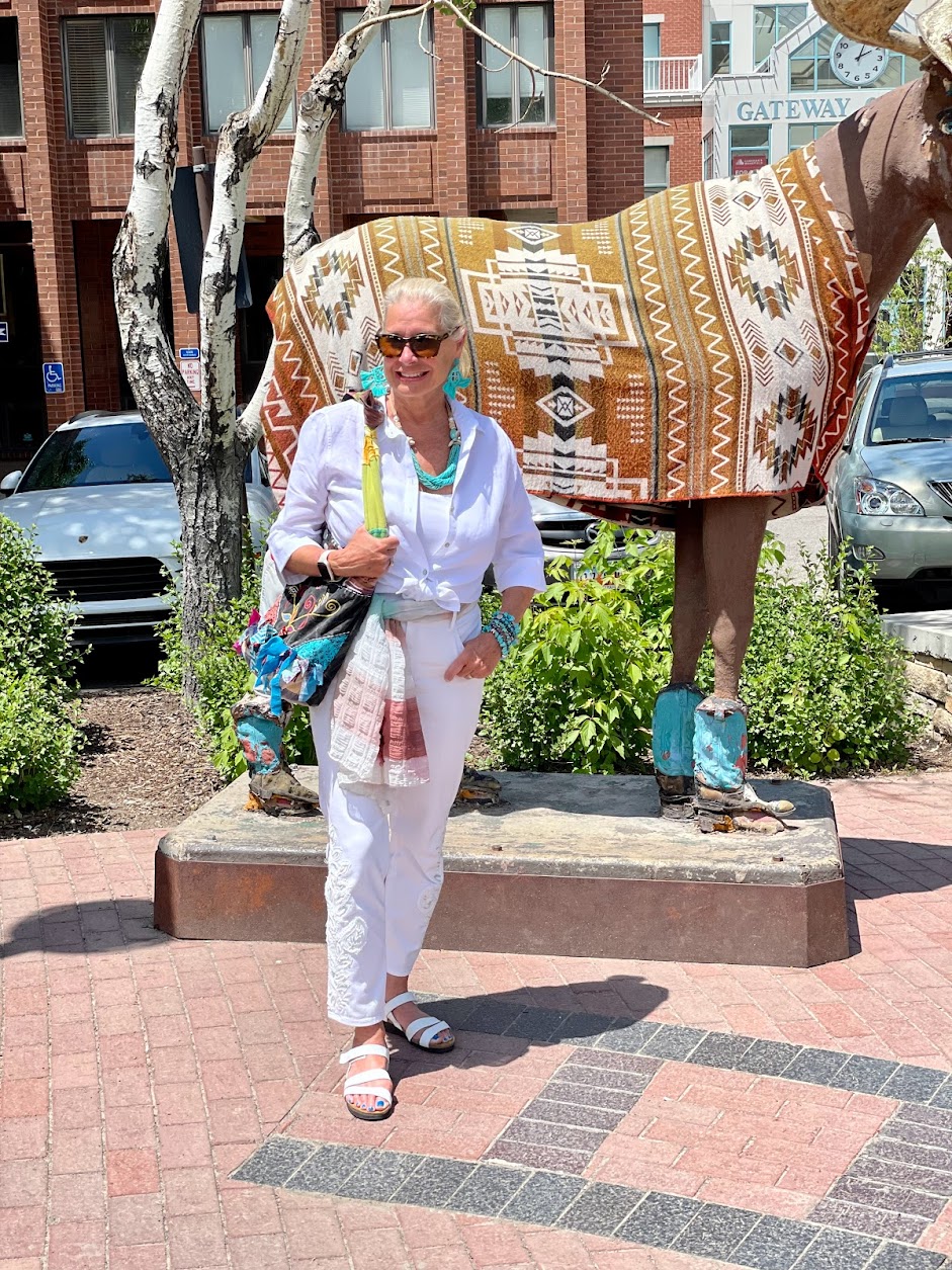 I purchased two scarves for this outfit. My favorite scarf was from the Red Butte Gardens Gift shop in Salt Lake City. Yes, I love shopping in gift shops for unique items. The botanical garden is lovely and even has outdoor summer concerts!