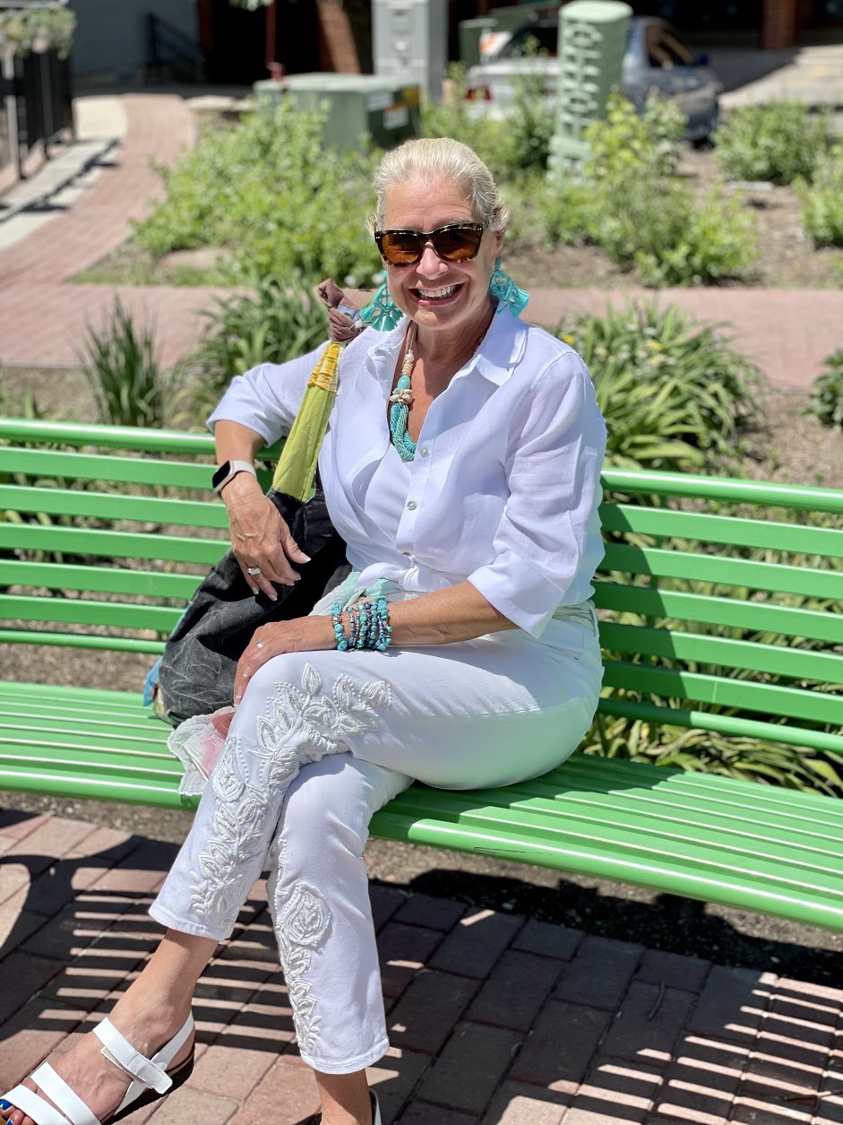 Wearing an all-white outfit is a classic style. You can wear all white yearly; it is never out of style. From daytime to evening, this style never gets old. I selected a white No-Iron linen shirt and Embroidered white ankle jeans for my outfit. Because I decided to leave my linen shirt open, I am wearing a white camisole. Wearing a linen shirt tied at the waist is one of my favorite looks.
