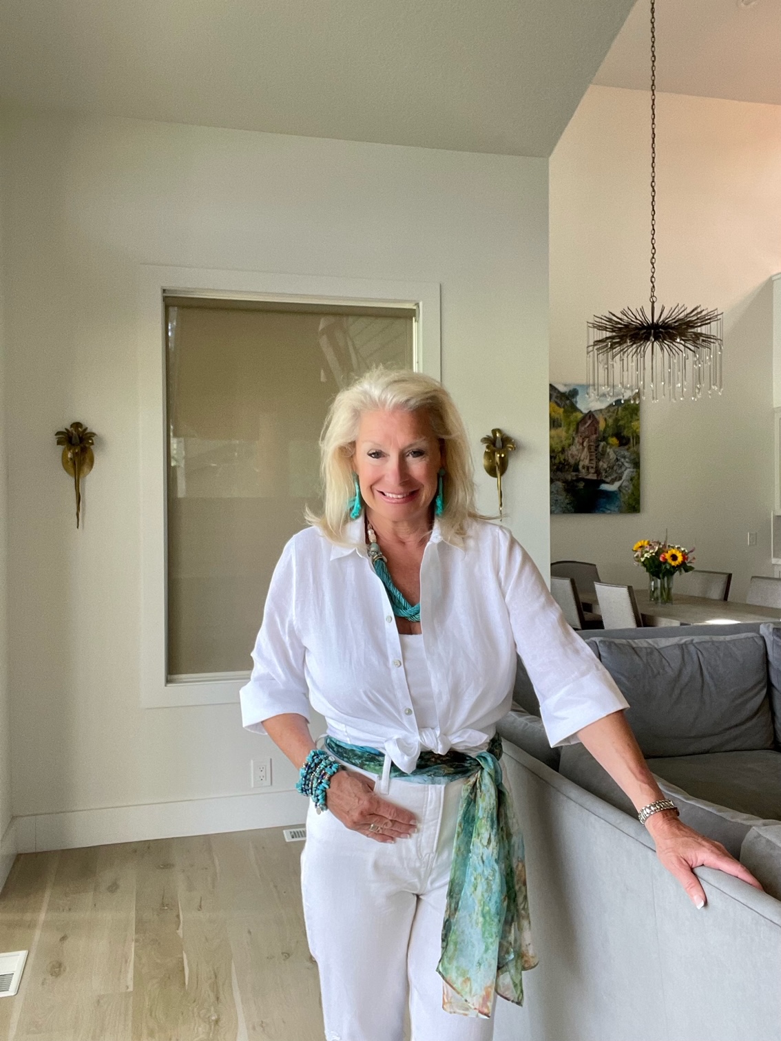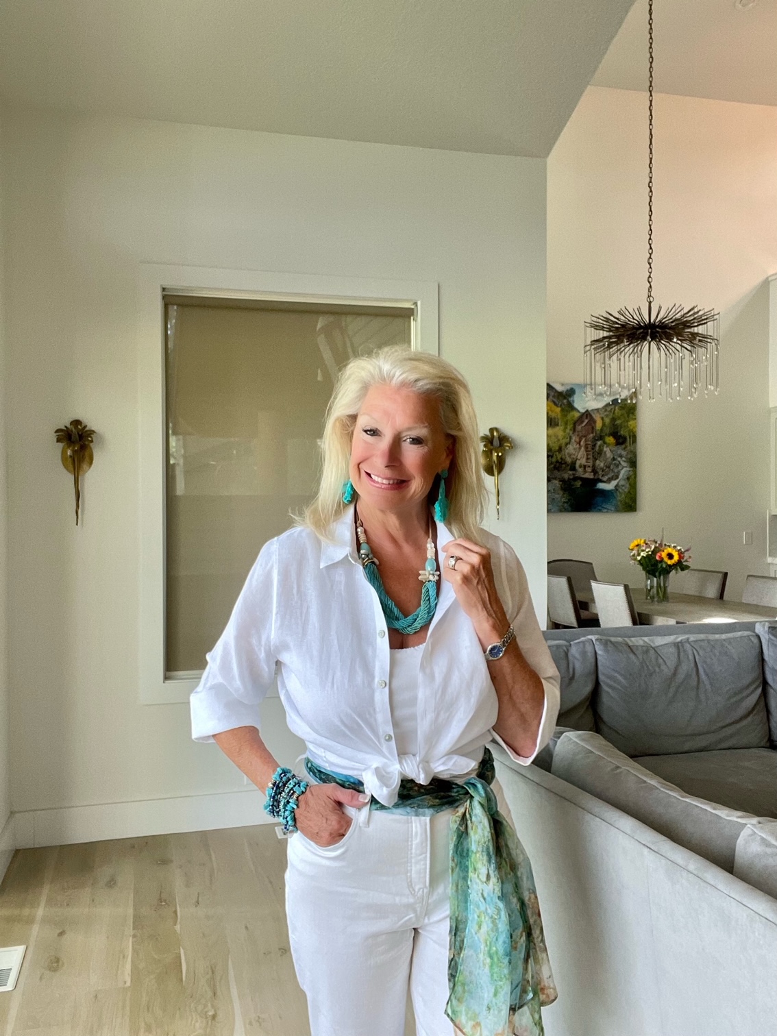 Add in a pop of color to your all-white outfit is so simple. Select your favorite summertime color and wear the color in your accessories. My favorite summertime color is turquoise, and I wore the color in my jewelry and the scarf I used as a belt.