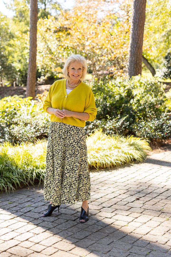 I selected the Abstract Animal Print Greenwich Skirt also from Saint and Sofia for a dressier way to style the cropped cardigan. It’s such a fun print and looks great with the cardigan.