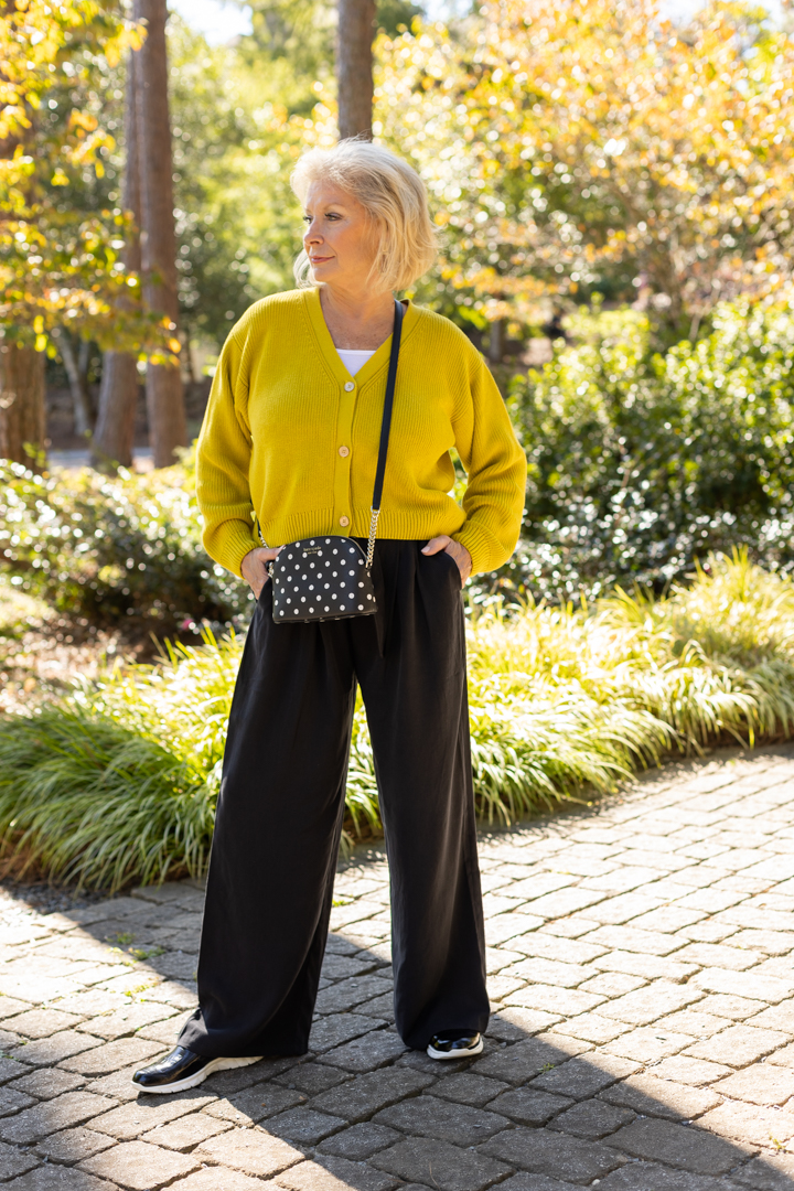 I thought it would be fun to wear the pants and cardigan with this cute little cross-body bag to complete the look.