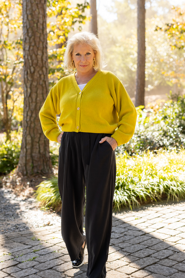 With all the new high-waisted pants trending it’s easy to wear a cropped cardigan and not worry about your midriff showing. My midriff has had its glory days and will stay covered up thank you very much. But if you’ve got a great midriff, by all means, wear lower pants.