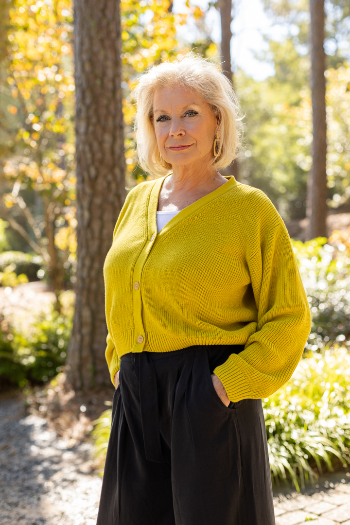 This beautiful cropped cardigan in lime is made from the softest organic cotton. With a relaxed, easy feel you can easily layer this on cooler days or warmer evenings. I threw on a white tee shirt underneath for a casual look.