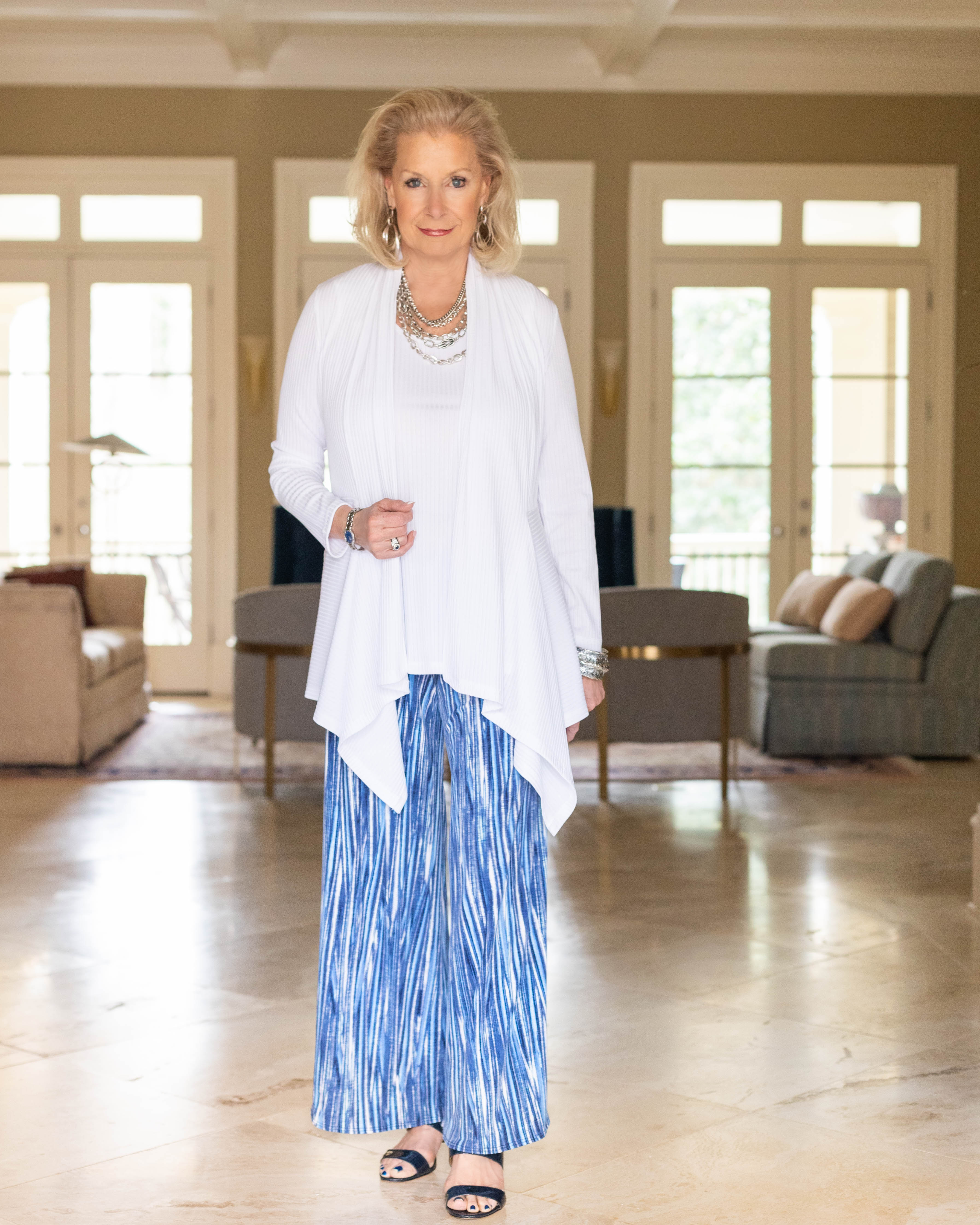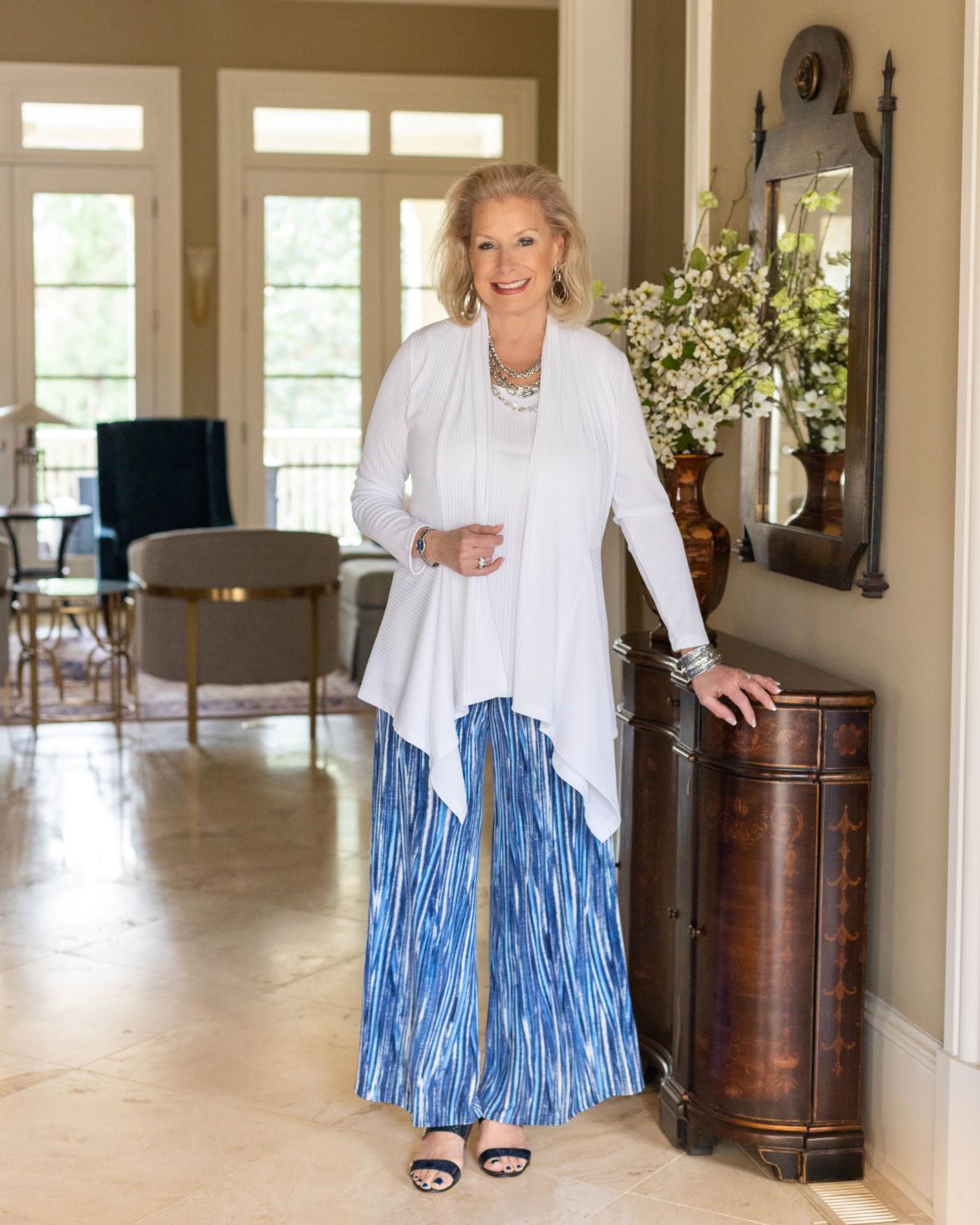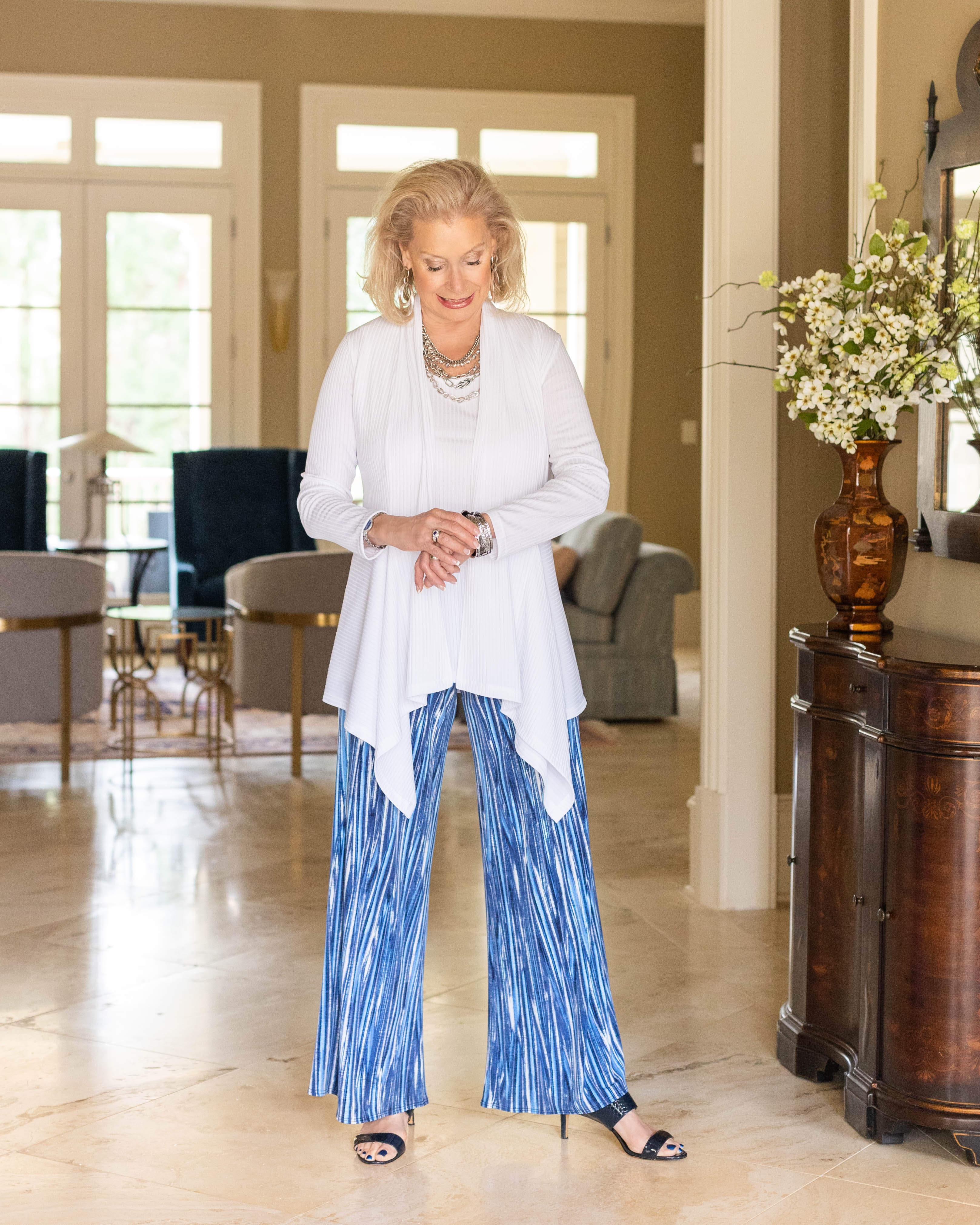 I selected these beautiful shades of blue palazzo pants to go with the tunic cardigan. Clara Sunwoo’s palazzo pants are my favorite! You have seen me wear them in these posts: