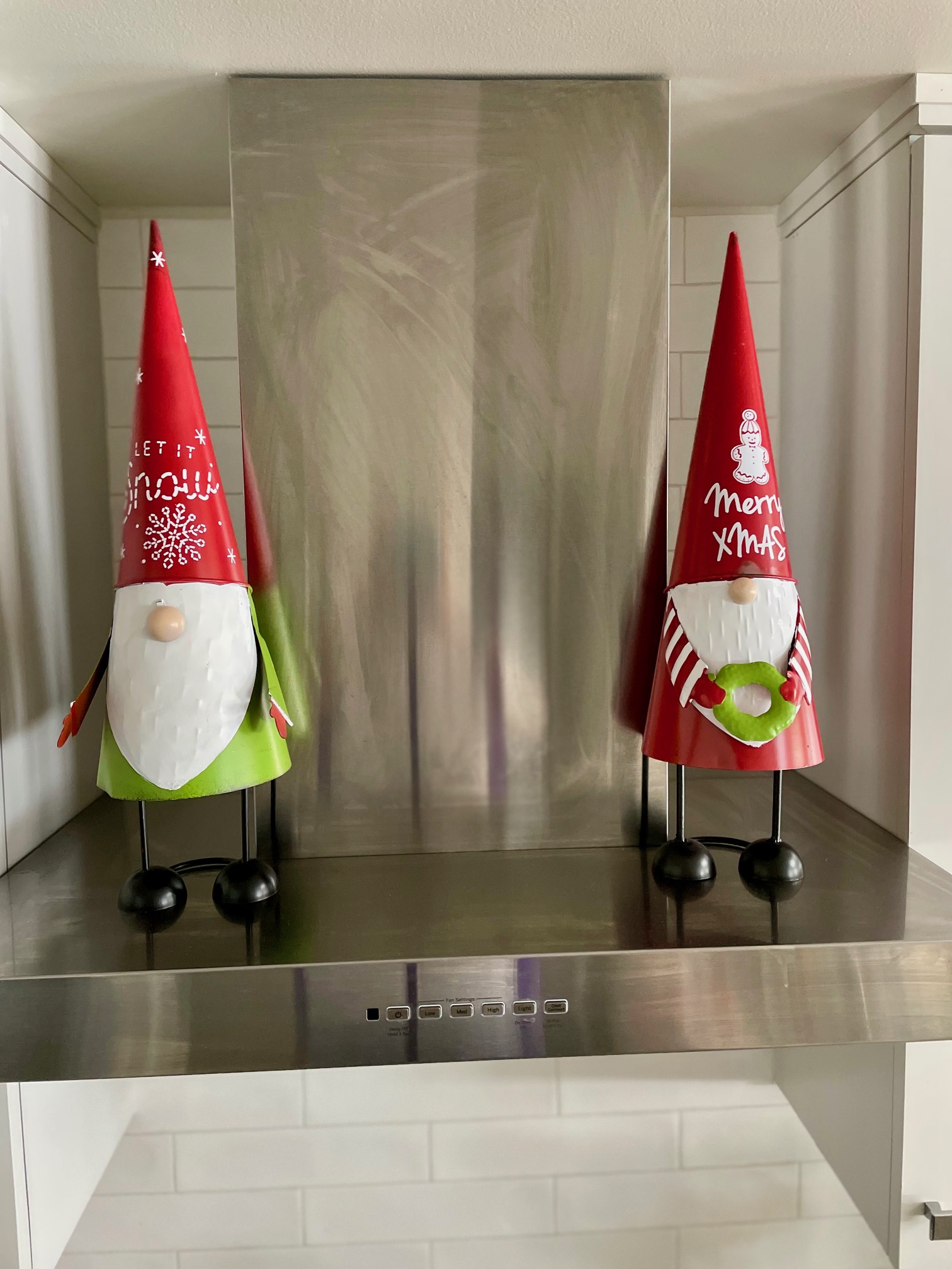 I found these cute metal gnomes at HomeGoods and thought they would look cute on my range hood.