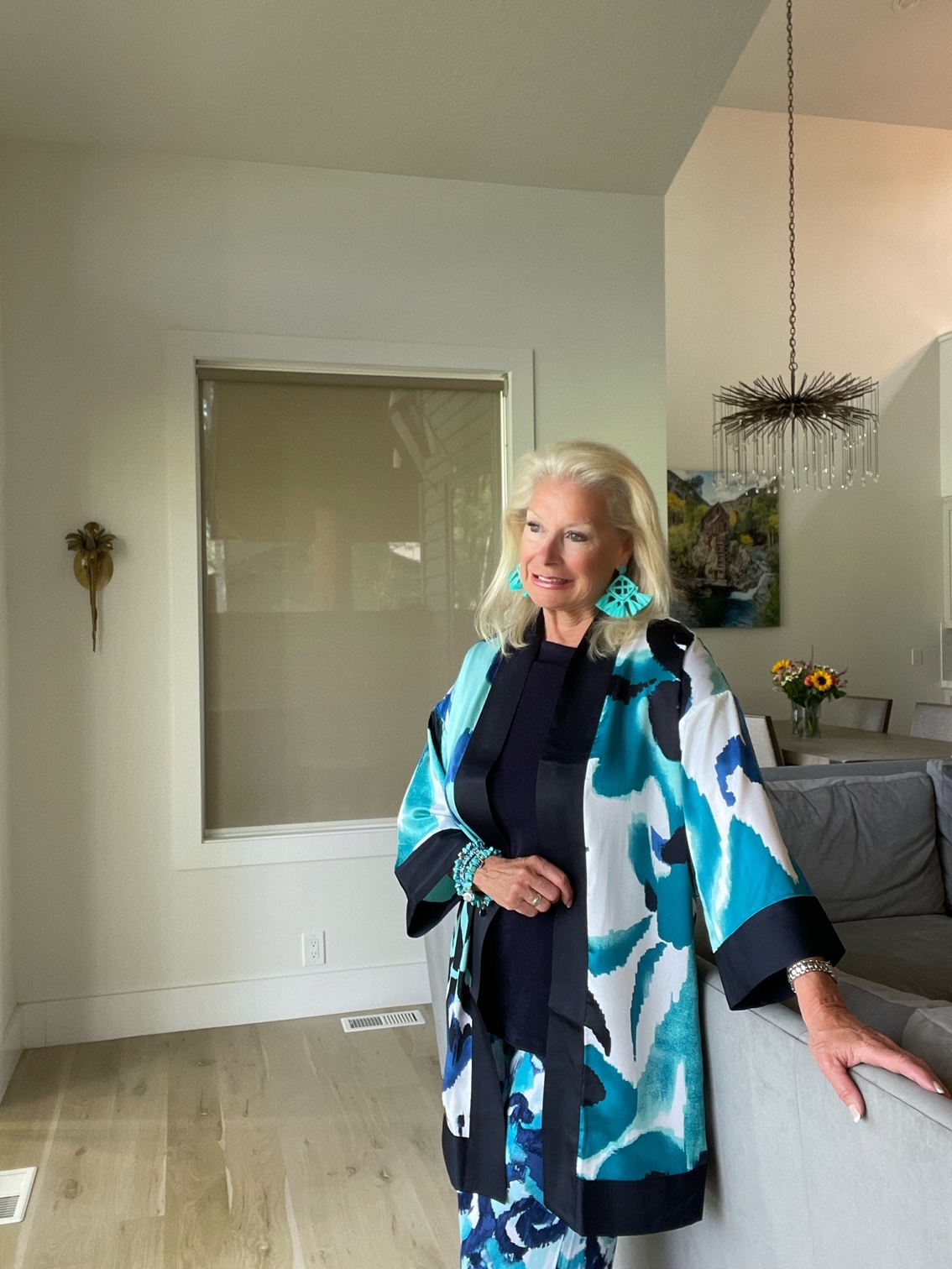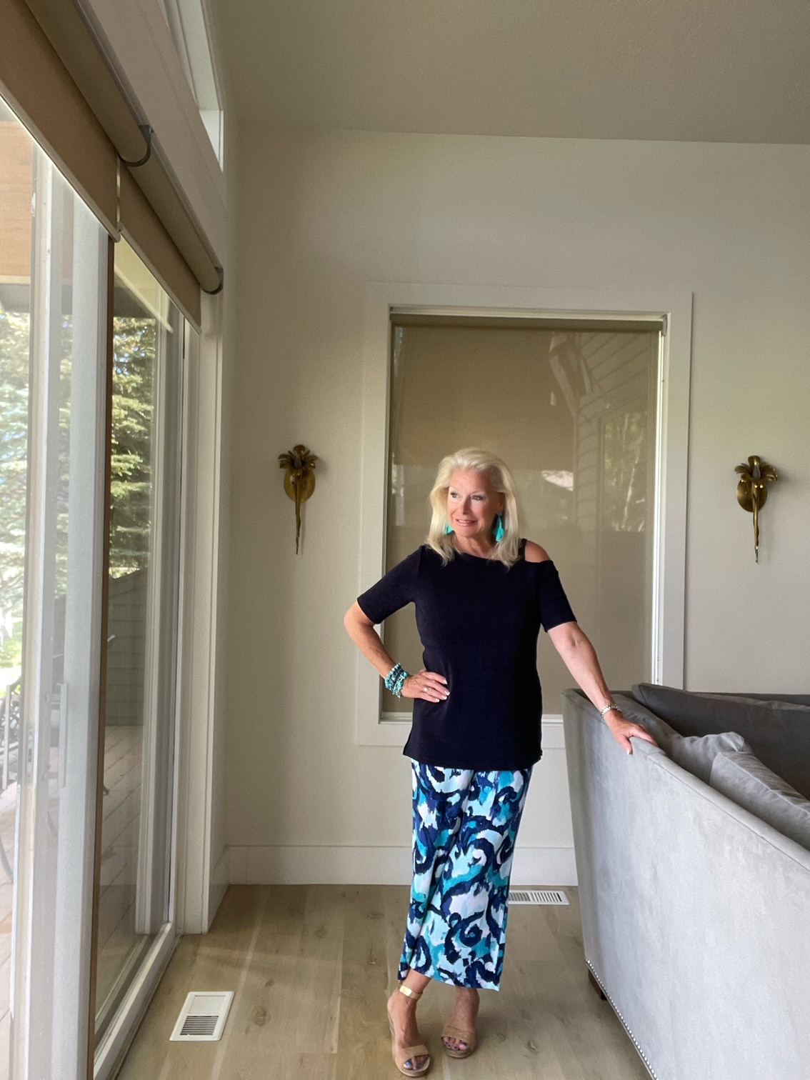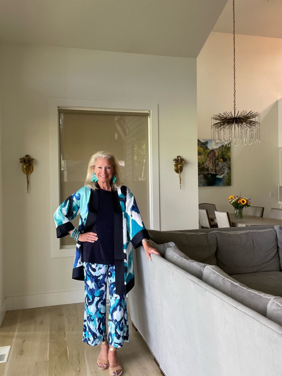 We celebrated Sammy’s 34th birthday on Wednesday, and I wore this Travelers Scroll Print Kimono and Wide-legged Crops to her birthday dinner. Birthday dinners call for a special occasion outfit in our family. I love the shades of blue in the Scroll Print Kimono and Cropped Pants. They are made with soft and lightweight wrinkle-resistant fabric.