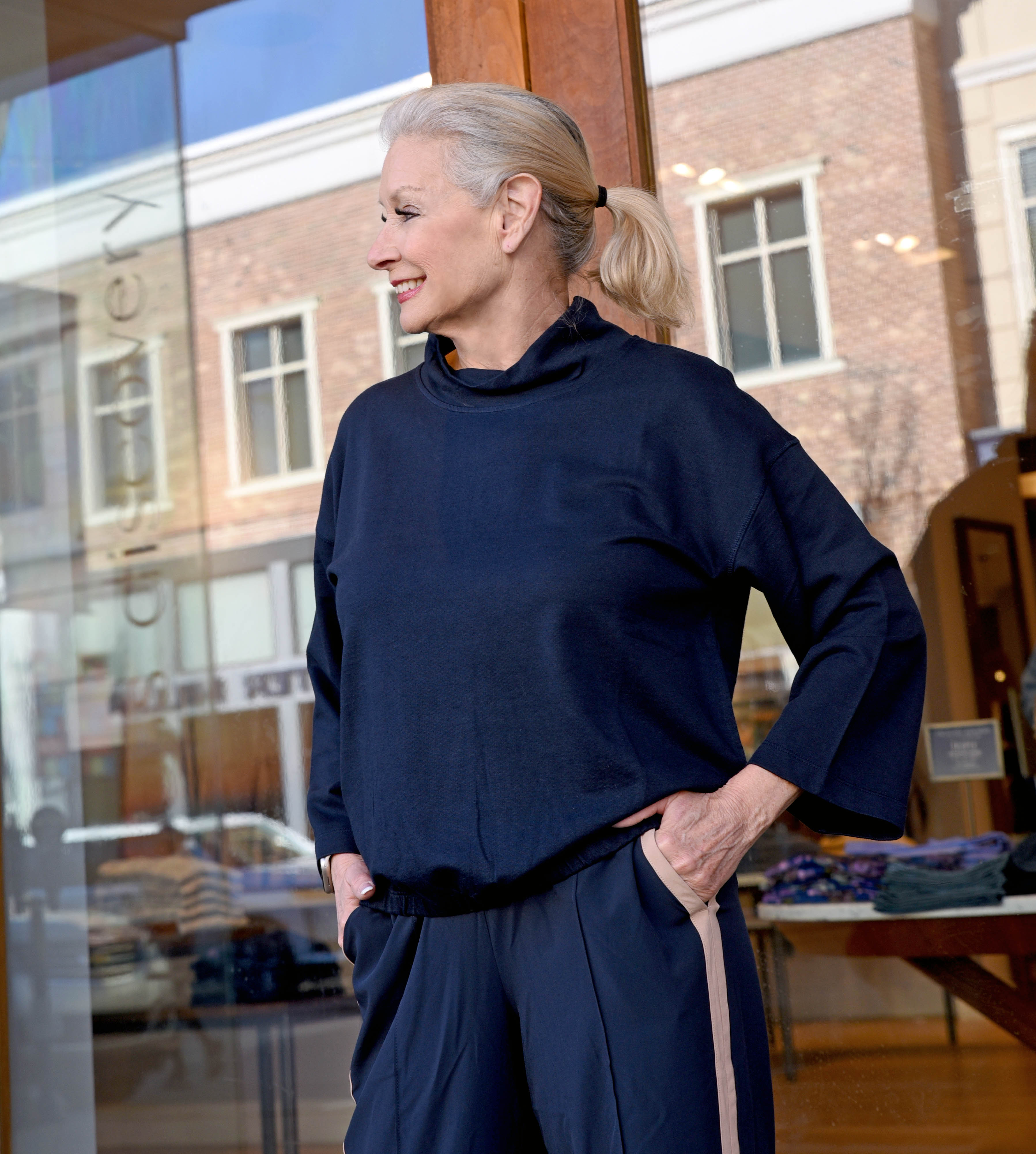 When I need a little workout motivation, I buy new clothes to give me a reason to hit the gym or get my cardio in. I was really pleased to see this new FIT collection when I visited my local J.Jill store for my Dressing Room Confession this month. There are so many wonderful pieces, but I selected two outfits that work for me. The navy Fit Soft Funnel-Neck Top with the Fit On-The-Go Side-Striped Wide-Leg Pants are perfect for running errands, taking walks, or just lounging in. Designed to take you from workouts to weekends and travel, this outfit is a perfect addition to your closet. I tried on a medium in both the top and bottoms, but I think I could also wear a size small. However, I never do!
