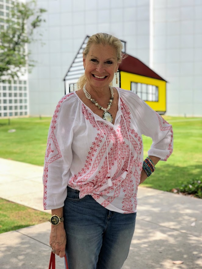 I wore this top with a white denim skirt on the trip and it was perfect for the Savannah weather. White denim skirts are wonderful to pack because they hardly wrinkle and the peasant top has an easy-care fabric.