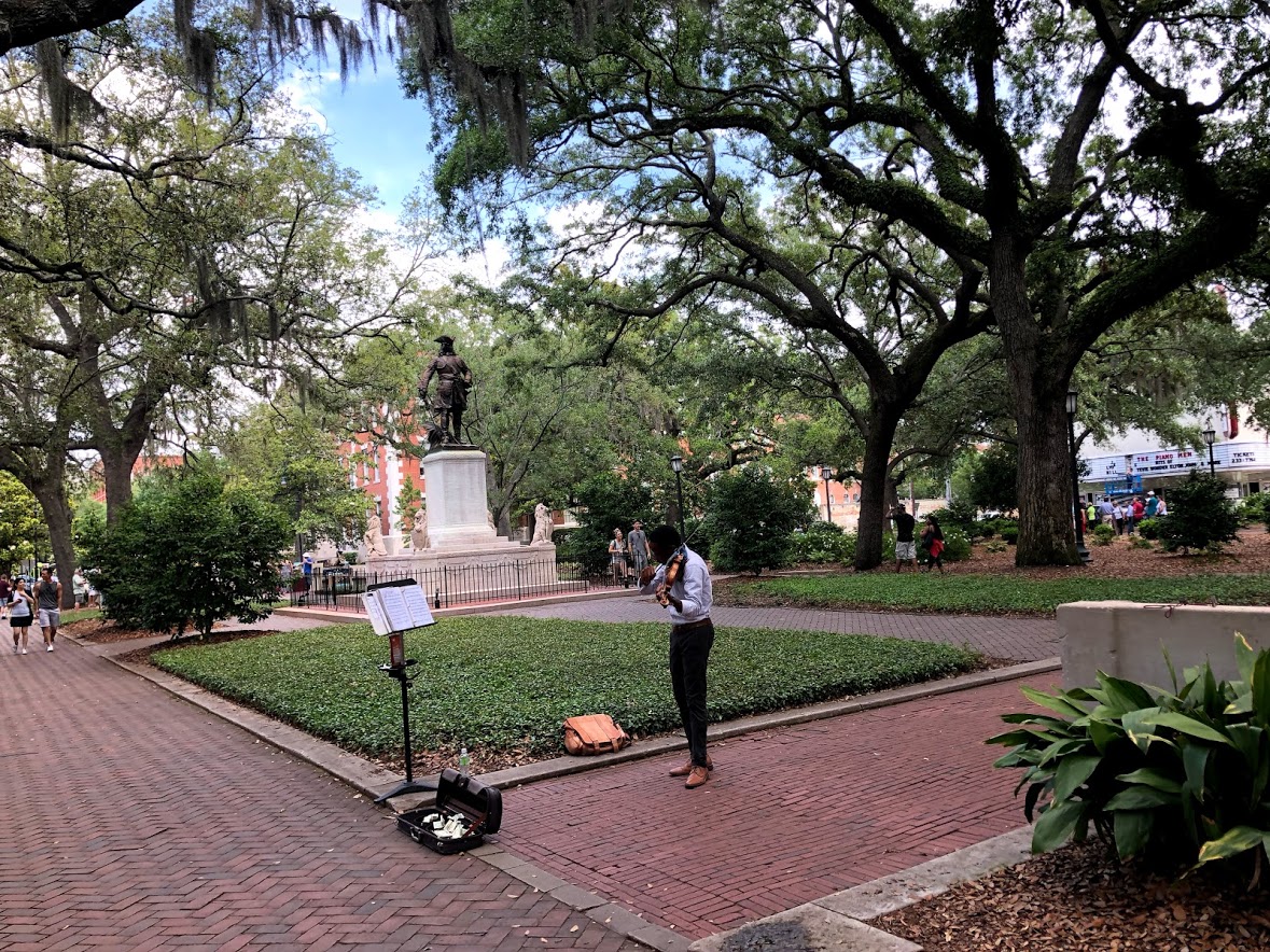 The Square is known for the famous park bench scenes from the critically acclaimed film Forrest Gump. In the opening shot of the film, a feather floats high above the trees, then sweeps down past the Independent Presbyterian Church and makes its way toward Chippewa Square, eventually landing at the base of a park bench. Tom Hanks, who plays the role of Forrest, sits on this park bench for about 80% of the film telling his life story to anyone who will listen. The bench that Hanks/Forrest sat on was actually a movie prop that has since been placed in the Savannah History Museum. Our tour guide told us that it was moved to the museum for preservation because people were cutting up the bench as a collector’s item. But the location of the bench for the movie in Chippewa Square is still a popular spot for photographs. This young man played most of the afternoon and many artists were sitting along the square painting.