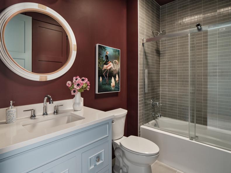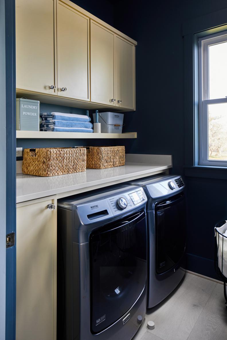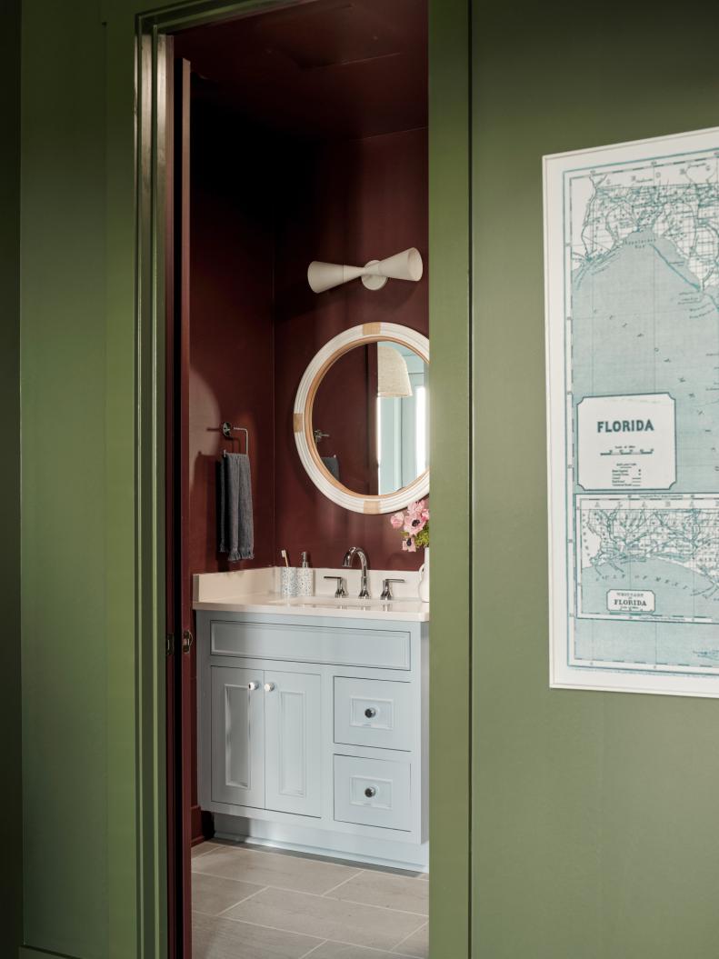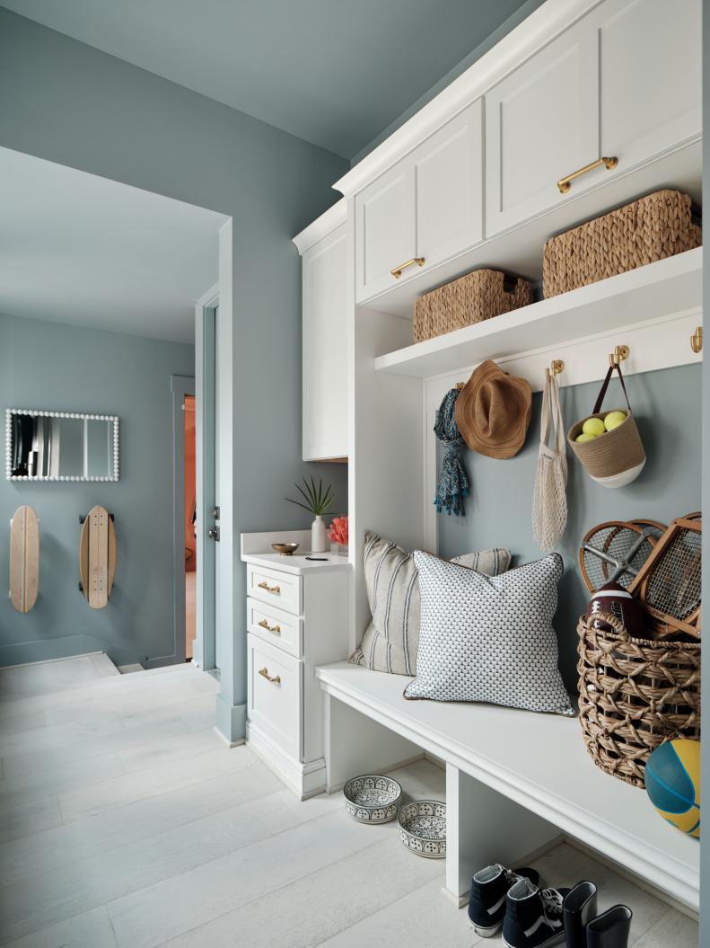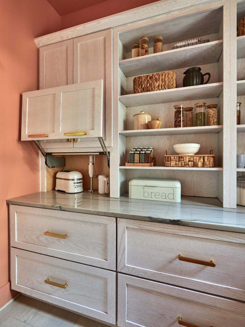 This stylish pantry has a lightened-up terra cotta hue called Persimmon on the walls, ceiling, and trim. This 2024 HGTV Home by Sherwin-Willams Color of the Year is an ideal mix of earthy and vibrant.