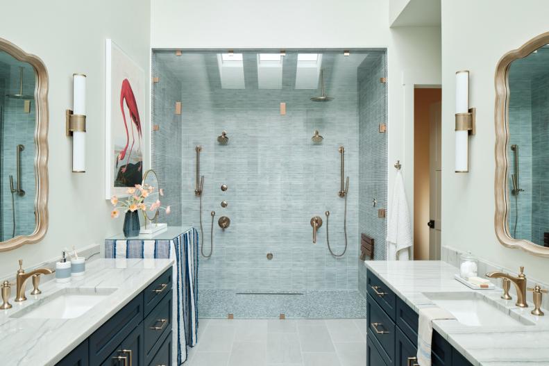 A spacious steam shower offers a spa-like experience at home, with dual shower heads, single-setting hand showers with slide bars, body sprays, and an overhead rain can shower head. This deluxe design allows you to customize the shower to your personal preference for soothing relaxation or invigorating rejuvenation.