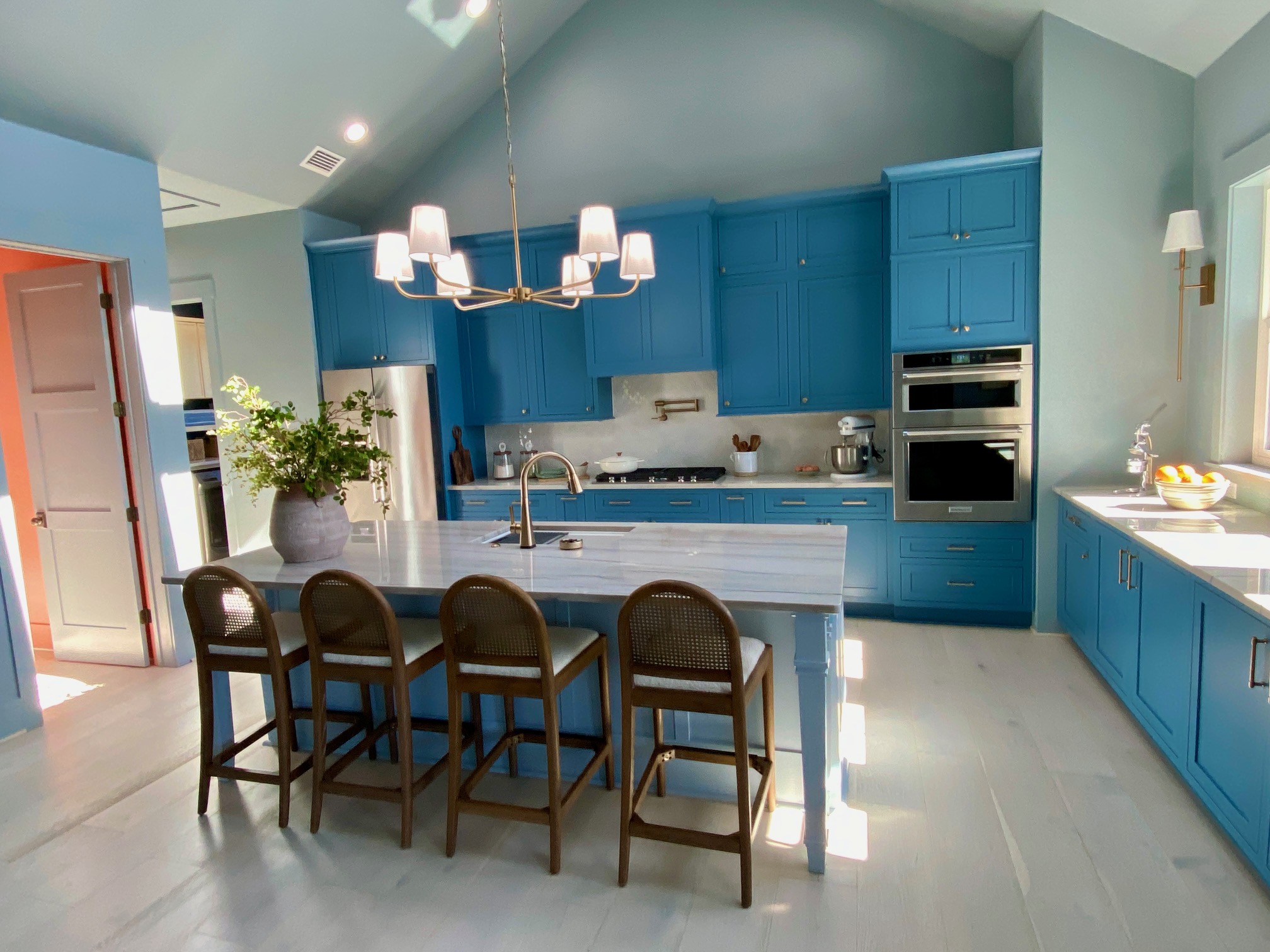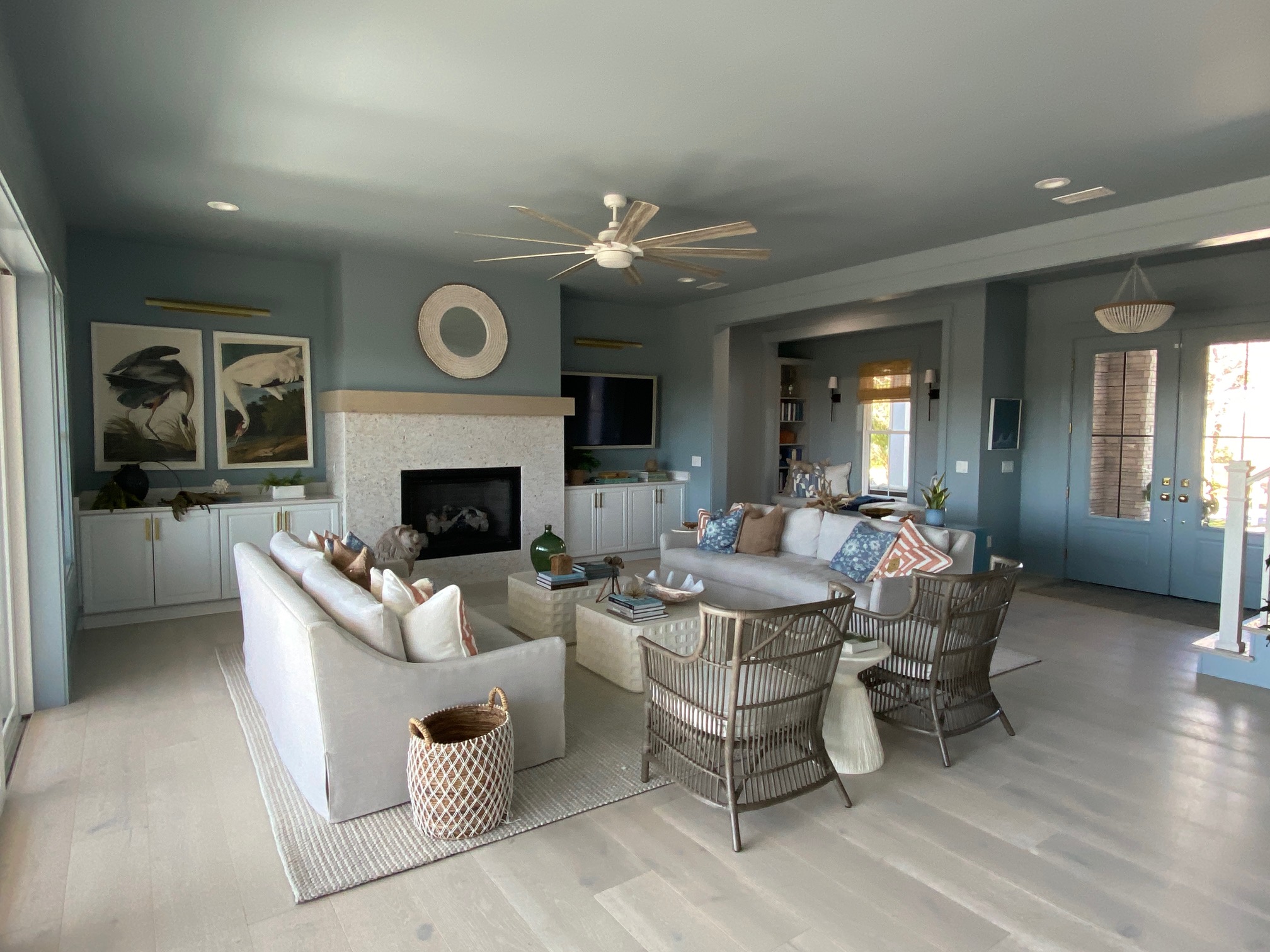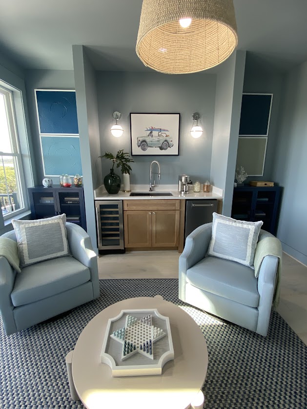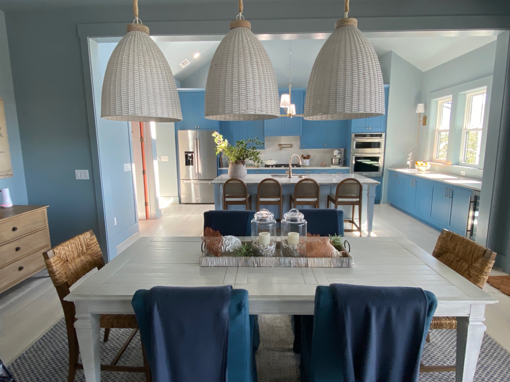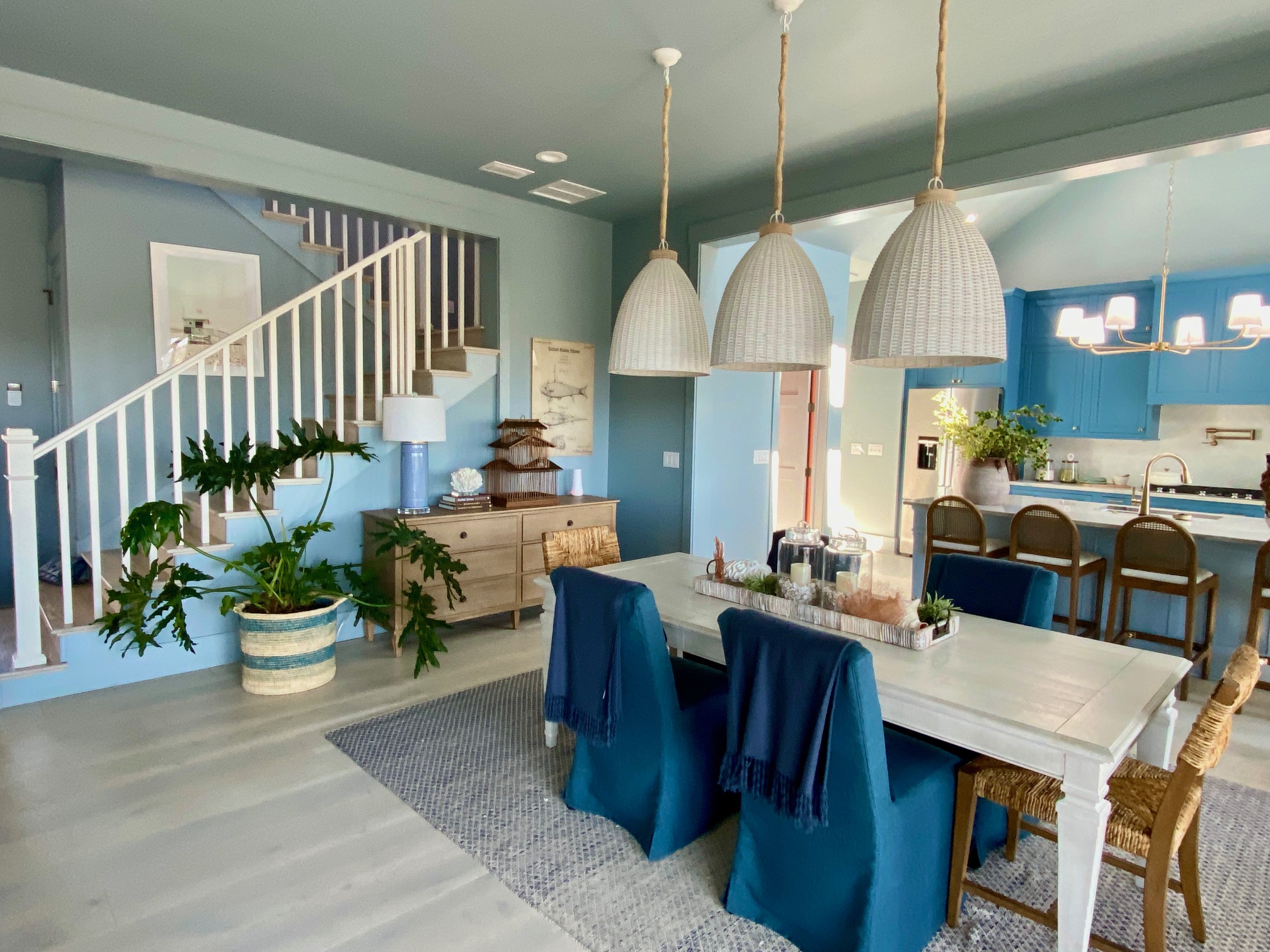 The main color throughout the house is various shades of blue creating a calming effect when you walk into the house. This open floor plan is perfect for entertaining. I happen to love all the different shades of blue in the house. As designers, we are adding color back into the homes we design and moving away from all-white interiors.