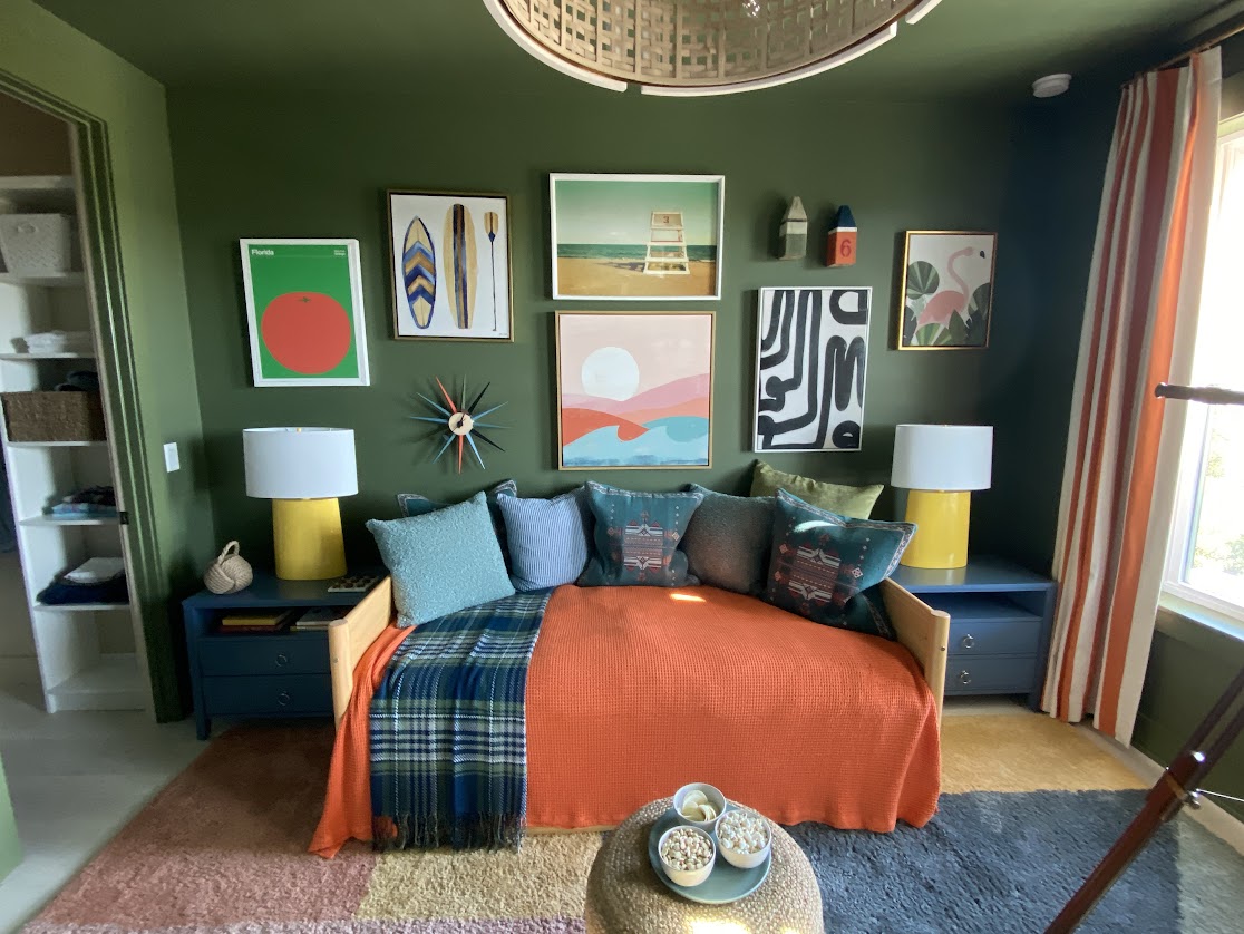Soothing olive green contrasts beautifully with the vibrant artwork and orange-toned duvet on the day bed for an unconventional vibe that still feels current and engaging.