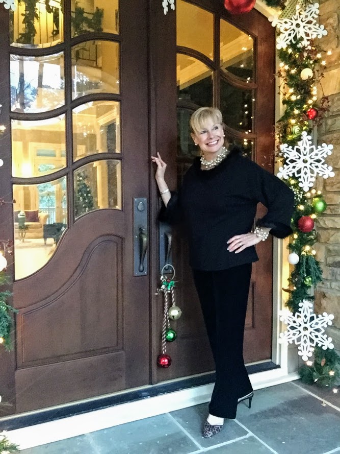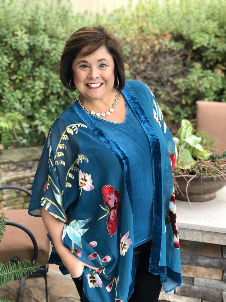 Regan of Nifty50andFabulousis ready for a holiday party in this velvet print kimono. Blue is a wonderful color to wear for a holiday party!