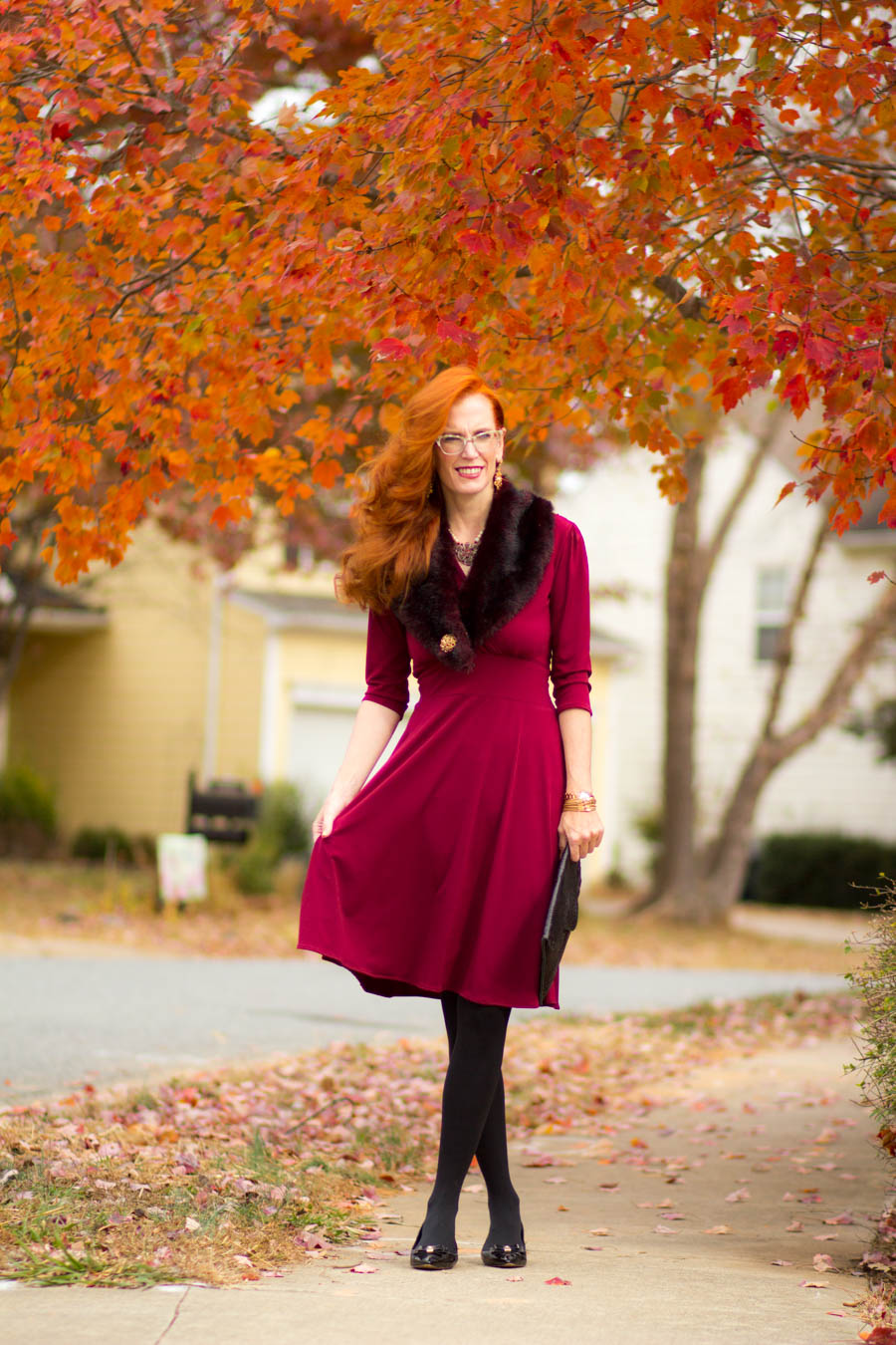 Jess from ElegantlyDressedandStylishĀ is wearing a fur-trimmed merlot-colored dress for her holiday fashion.
