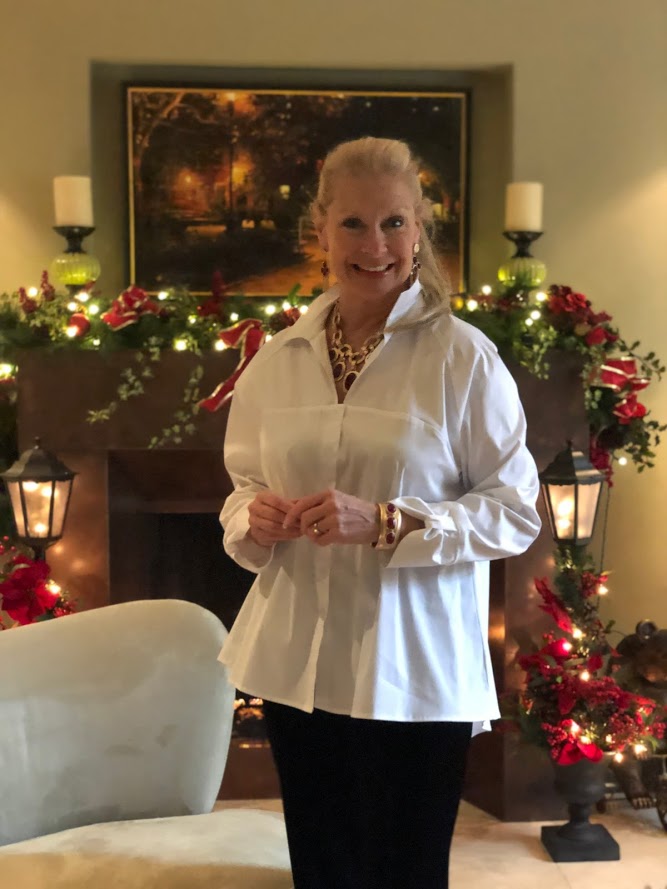 Nothing beats an easy holiday style than throwing on a classic white shirt with black pants. I purchased this top for my trip to Half Moon Bay in July but I love how it will be worn to my holiday parties this year withĀ my velvetĀ pants and red and gold jewelry.